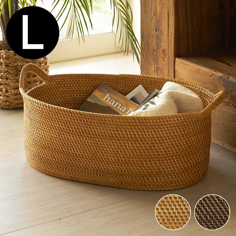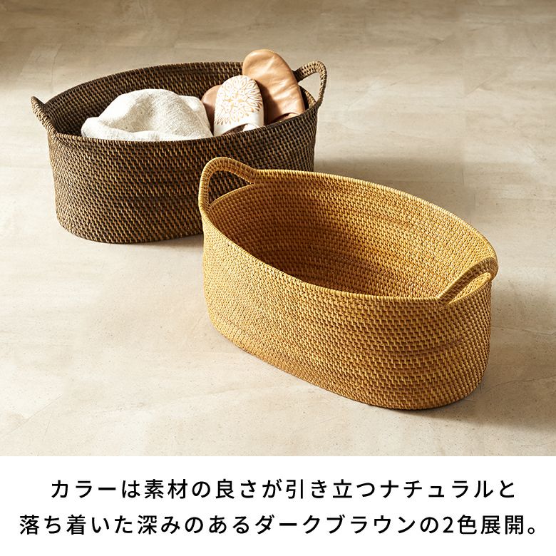 カラーは、ラタンそのものの自然な風合いを楽しめるナチュラルと、落ち着いた深みのある色合いがアジアンムードたっぷりなダークブラウンの2色展開。数多くのラタンバスケットを取り扱うアジア工房が自信を持っておすすめする新シリーズです。サイズはS・M・Lの3種類。こちらは、ランドリーバスケットとしても使える大容量のLサイズ。用途に合わせてサイズ違いを一緒に使うと、インテリアに統一感が生まれておしゃれに。