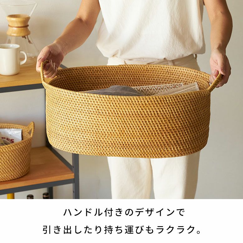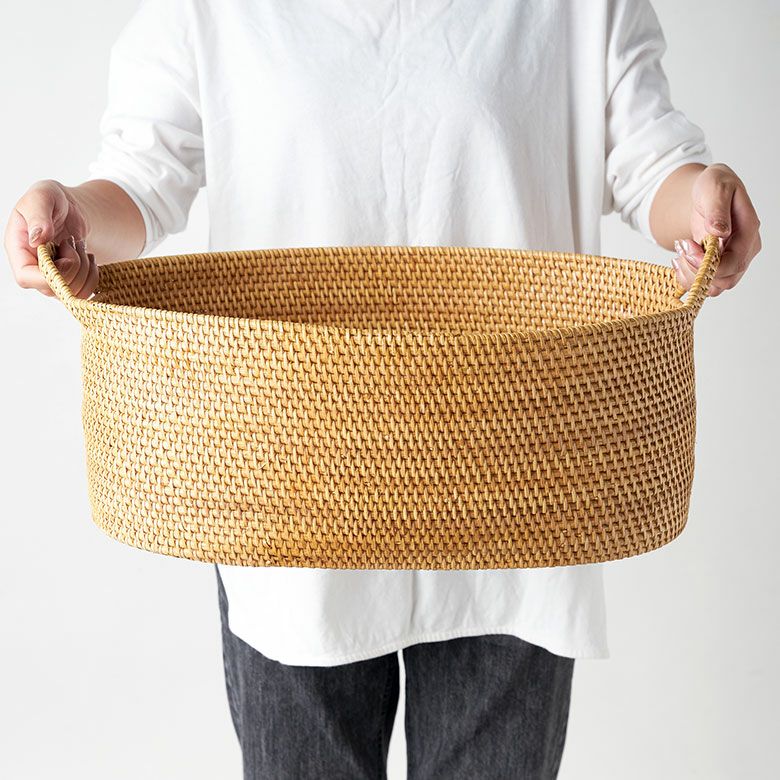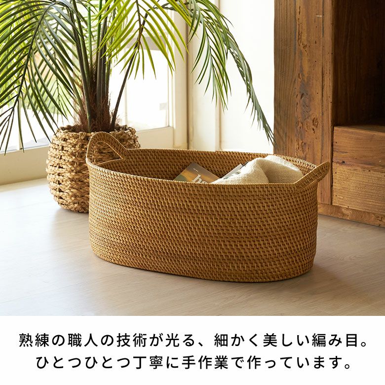 インドネシアの高品質な天然ラタンを使用し、バリ島の熟練した職人がハンドメイドで一つひとつ丁寧に仕上げたバスケット。楕円状に曲げたラタンでバスケットの底面を形成し、その周りにラタンをぐるぐると積み重ね、高い強度を持つ天然ラタンのピールで丁寧に編み込んでいきます。これら全ての工程をハンドメイドで行い、ハンドル付きのかわいいオーバルバスケットに仕上げました。