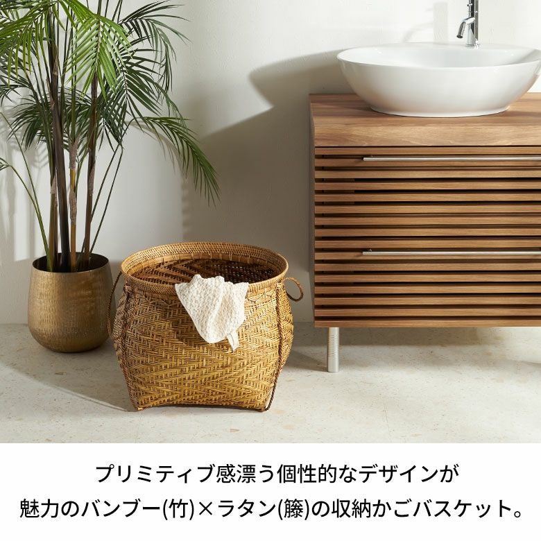 プリミティブ感漂う個性的なデザインが魅力のバンブー(竹)×ラタン(籐)の収納かごバスケット。インドネシアの熟練職人が一つ一つ丁寧に手作業で仕上げた、美しい編み目が特徴です。エコフレンドリーな天然素材を使用しているので、環境に優しいのも嬉しいポイントです。