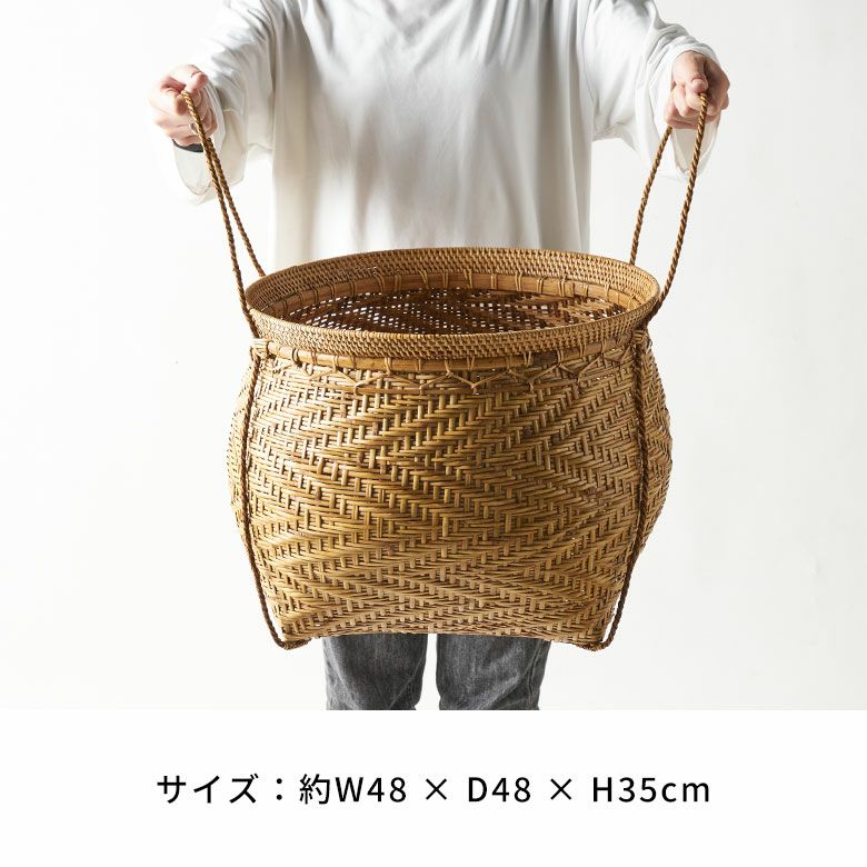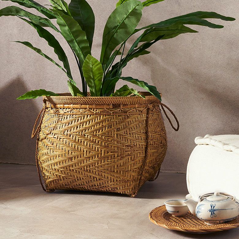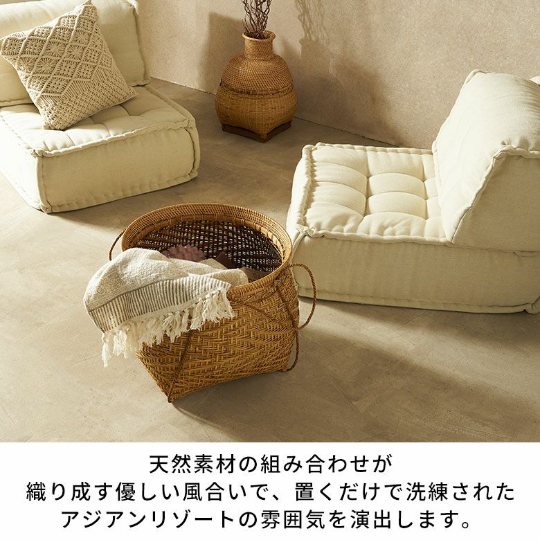 約67Lの大容量で、かさばる衣類やおもちゃ、雑誌などの収納バスケットとしてはもちろん、通気性も優れているのでランドリーバスケットとしてもオススメです。また、10号までの観葉植物の鉢カバーとしてもご使用いただけます。バンブーをロープ状に編み込んだデザイン性の高い持ち手が付いており、持ち運びもラクラクです。天然素材の組み合わせが織り成す優しい風合いで、置くだけで洗練されたアジアンリゾートの雰囲気を演出します。