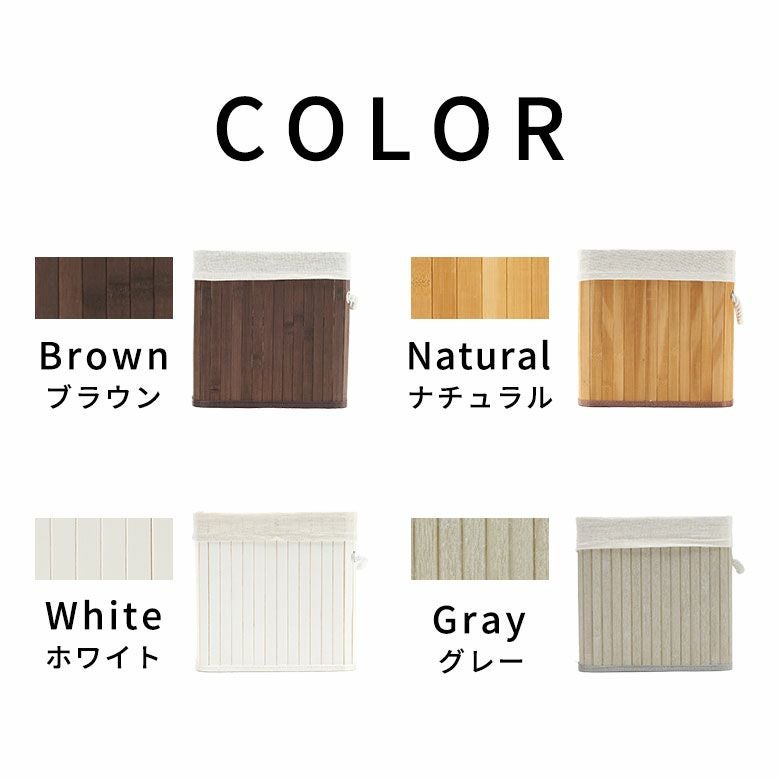 カラーはナチュラル、ブラウン、ホワイト、グレーの4色展開で、リビングや寝室、玄関、洗面所など、さまざまな空間にすっと馴染みます。収納としての機能性と、インテリアのような美しさを兼ね備えたバンブーバスケットで、いつもの空間をより心地よく整えてみませんか。