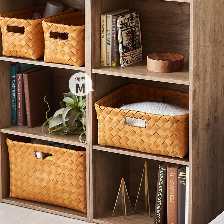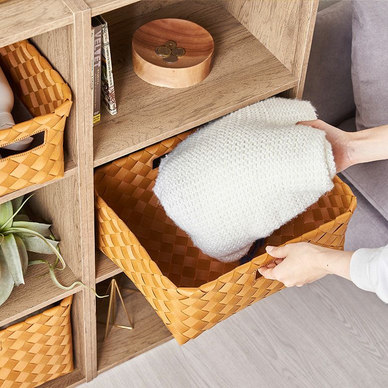 棚やカラーボックスに入れやすい大きさで、何でもサッと入れるだけで片付け完了。