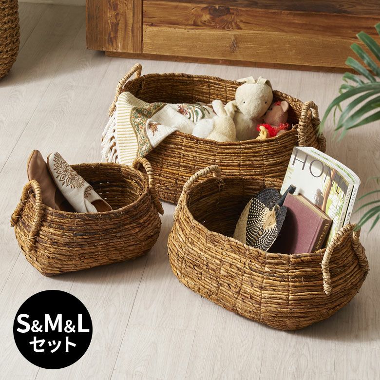 ・バリ島の職人が一つ一つ丁寧に編み上げた、楕円形バスケットSML3個セット