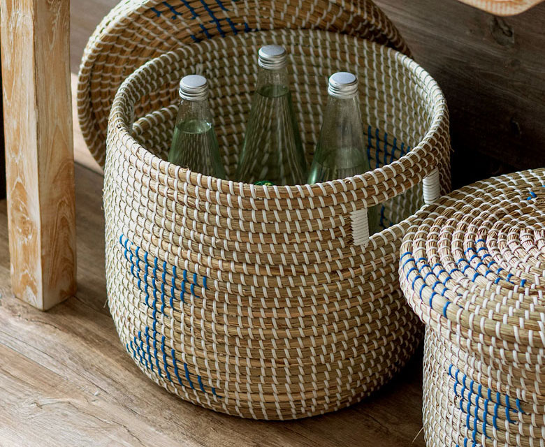 天然素材の風合いを生かした、爽やかなデザインのシーグラス製バスケット。