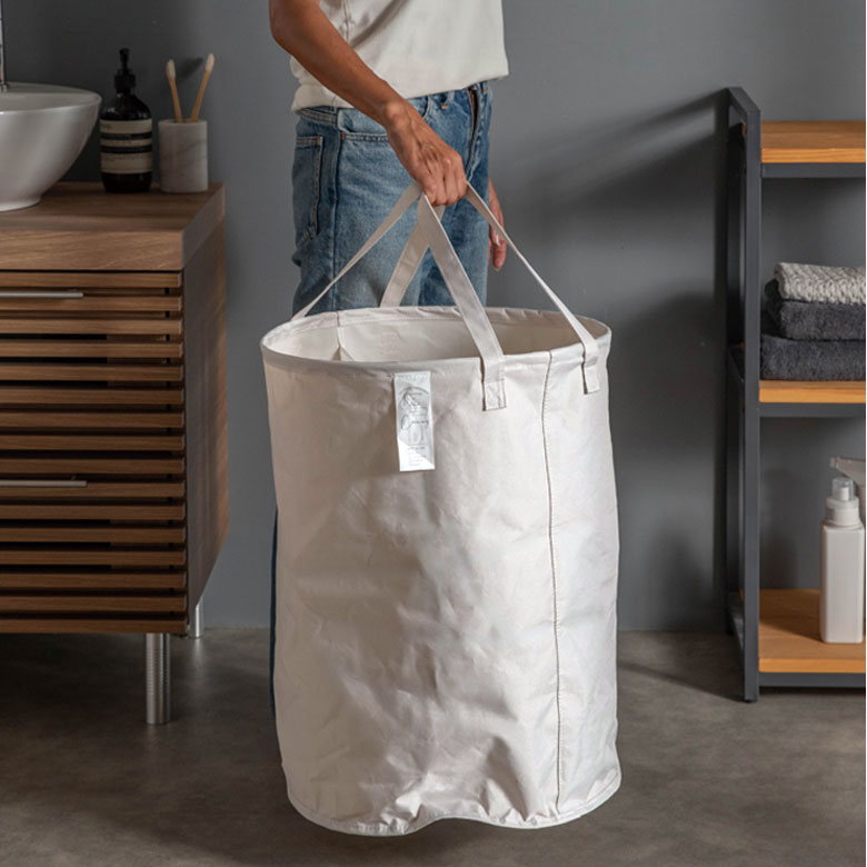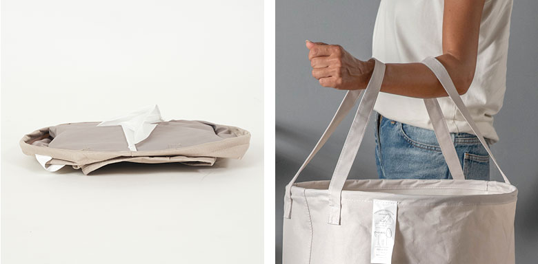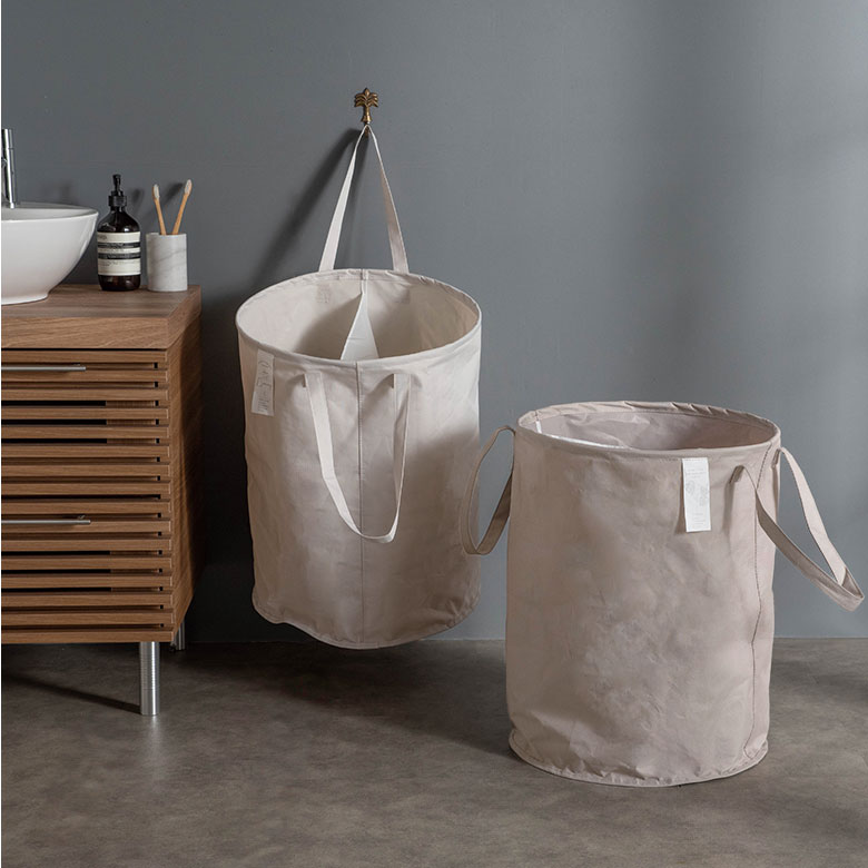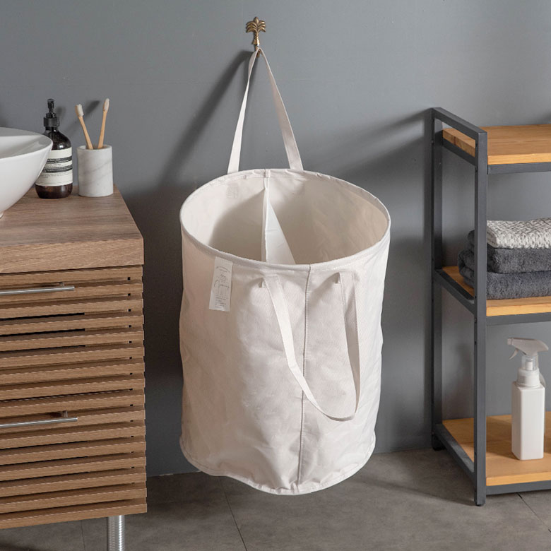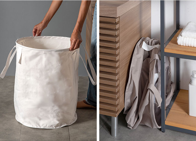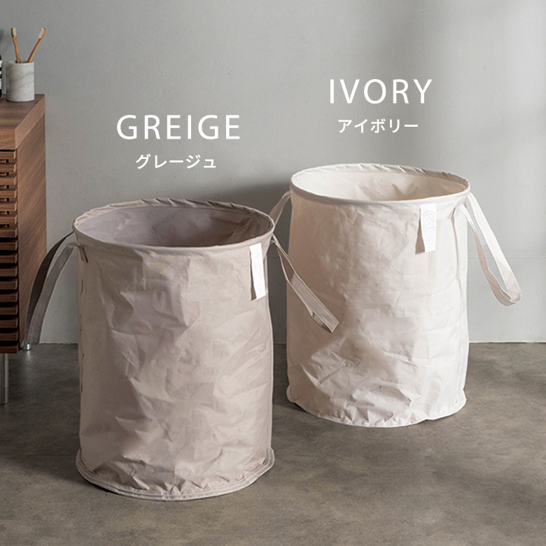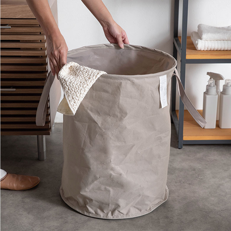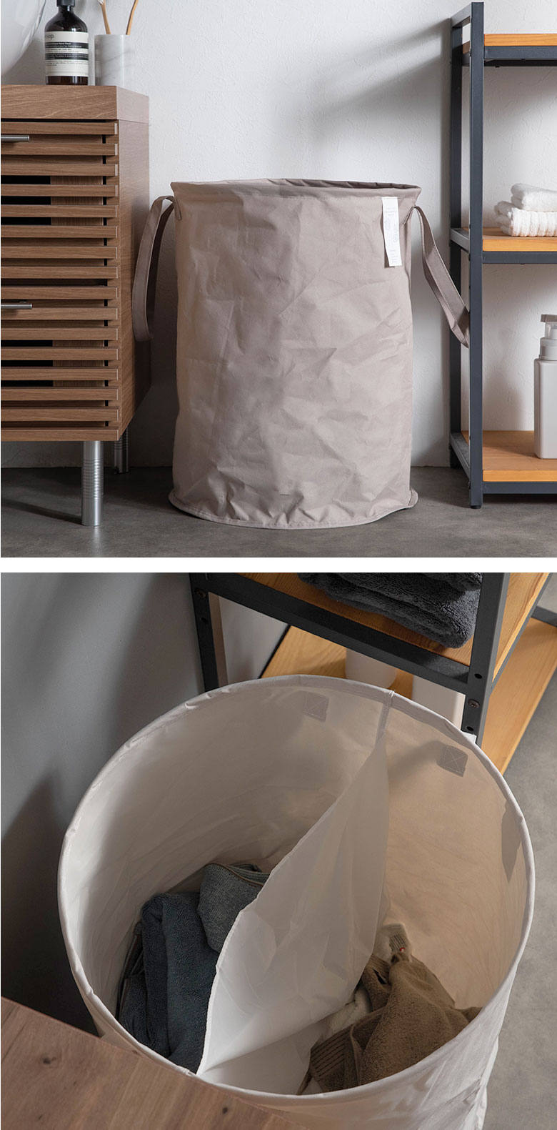 開口部はワイヤー入りで出し入れしやすく、使わない時は折りたたんで省スペース収納。中身を入れると安定して自立し、軽量で持ち運びもラクラク。ランドリールームはもちろん、リビングや子ども部屋、レジャーやアウトドアでも活躍します。カラーは、インテリアに馴染むグレージュとアイボリーの2色展開です。