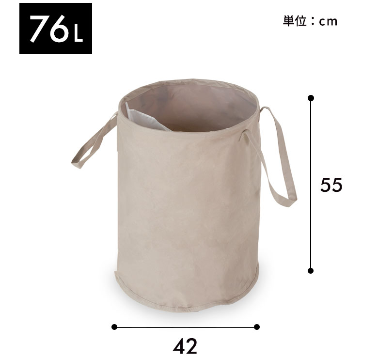 洗濯物をたっぷり収納できる76Lの大容量サイズ(直径42cm×高さ55cm)。中央の仕切りで、色物と白物、家族別などの仕分けが簡単にできます。カラー違いで揃えれば、タオル用・衣類用など用途ごとの使い分けにも便利です。防水加工(PEコーティング)を施しているため、脱水後の衣類やタオルも安心して収納できます。