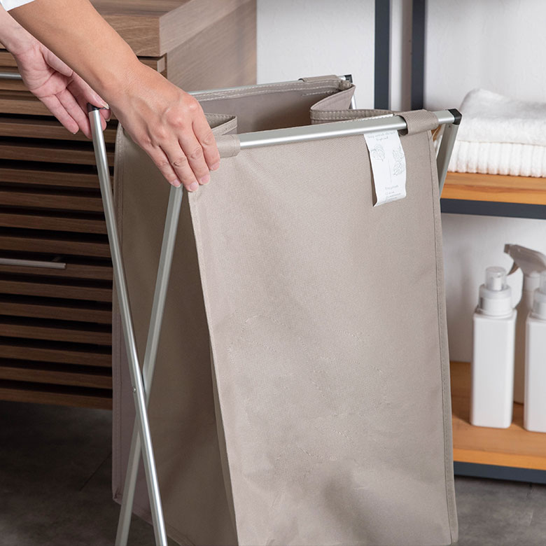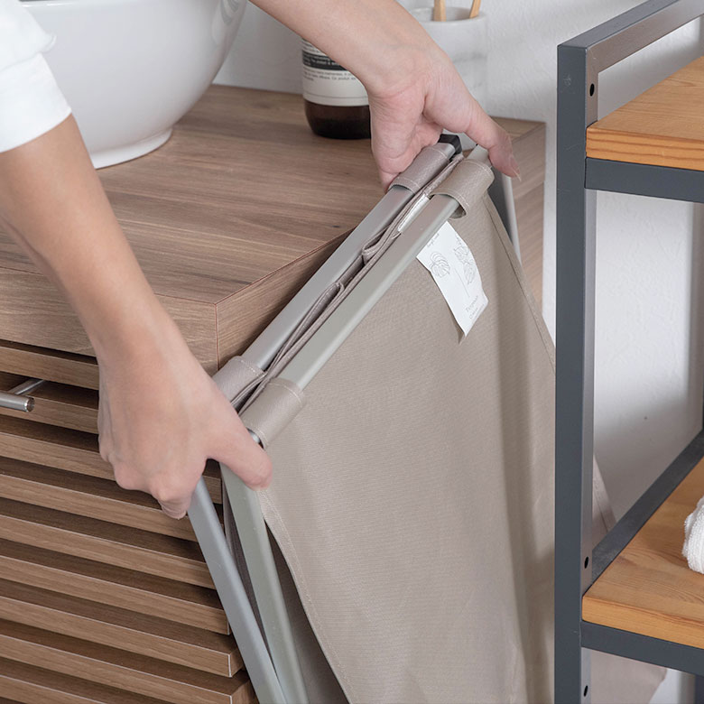 フレーム構造によりしっかり自立し、バスケット底部が床に直接触れない設計で衛生面も配慮しました。
