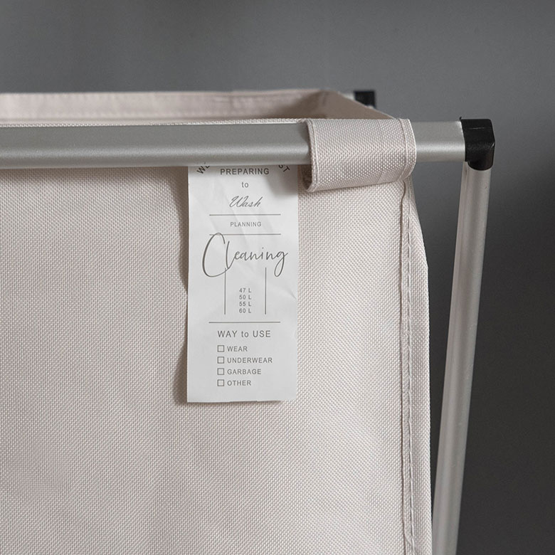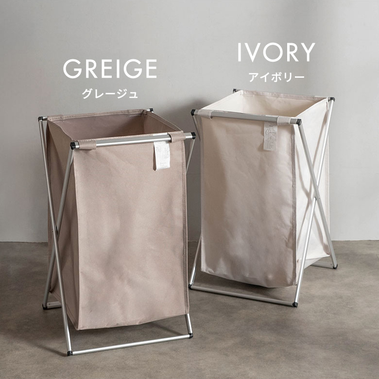 容量は約48Lで日常の洗濯物をしっかり収納。さらに45Lのゴミ袋がぴったり入るサイズで、ゴミ箱としても活用できます。カラーはグレージュとアイボリーの2色展開で、ランドリー以外のリビングやキッチン収納にも対応します。