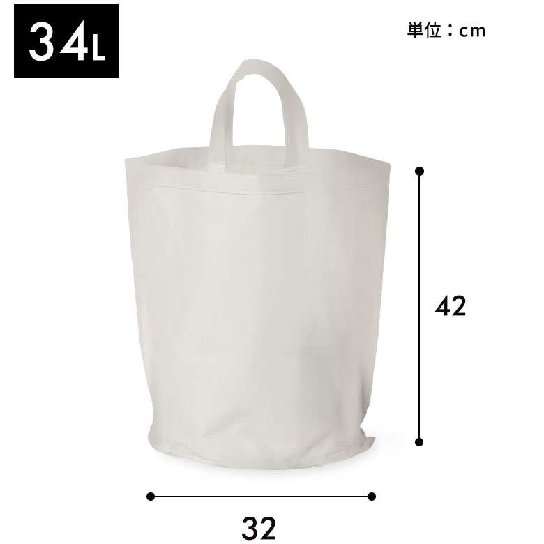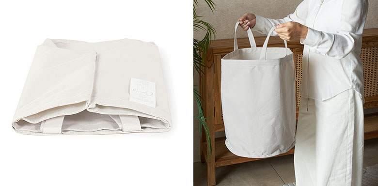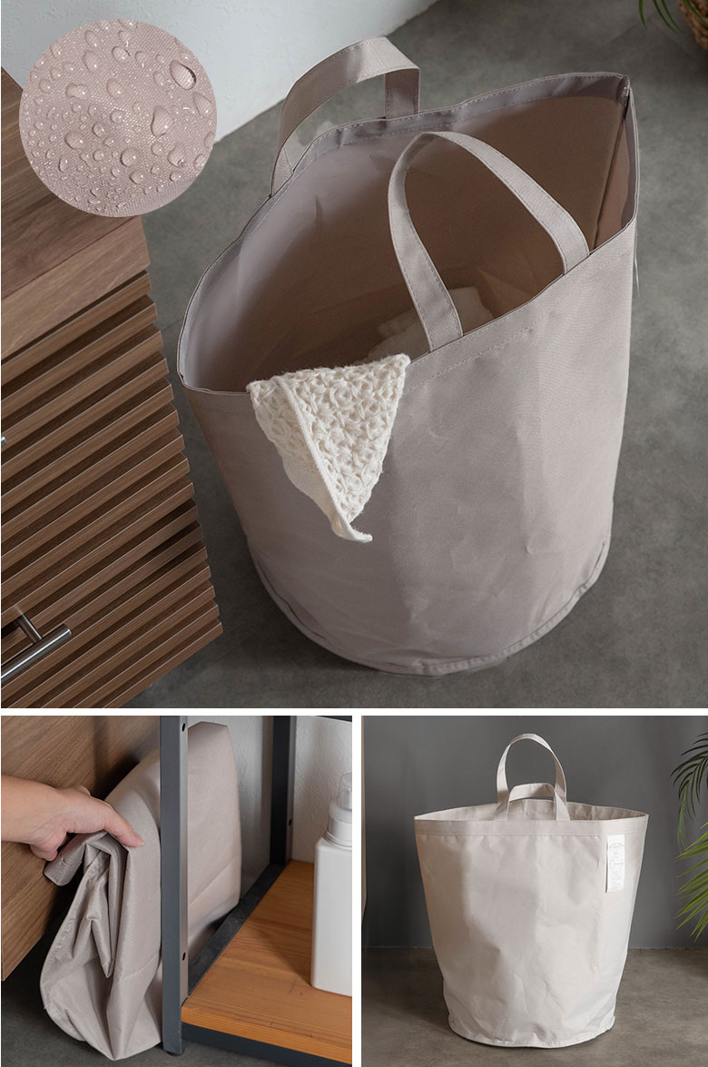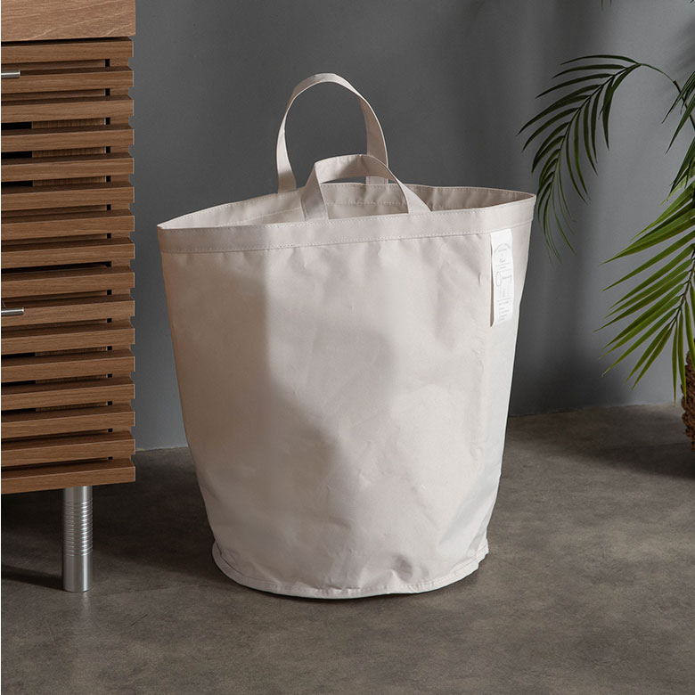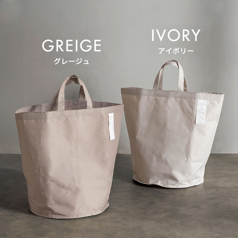 カラーはインテリアに馴染むグレージュとアイボリーの2色展開。トートバッグやエコバッグ、ショッピングバッグとしても使える便利なデザインで、底が円形の可愛らしいフォルムもポイント。レジャーやアウトドアにでも活躍する、おしゃれで実用的なランドリーバスケットです。