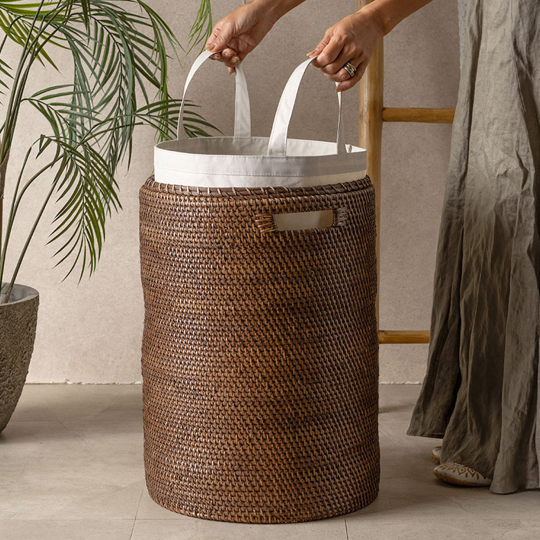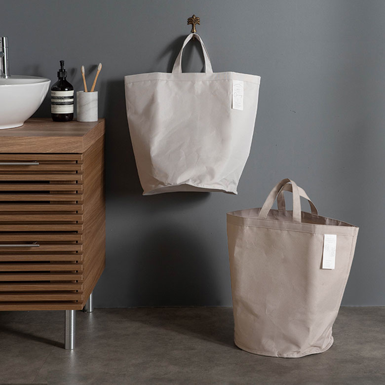 「アタとラタンで編まれたフタ付き大型バスケット」(別売り)にぴったり収まります。見た目はすっきり、洗濯物の出し入れもスムーズです。天然素材のバスケットでは難しい濡れた衣類も、防水仕様の本品をセットすれば安心して収納できます。ランドリーはもちろん、リビングやキッチンのゴミ箱など、用途が広がります。