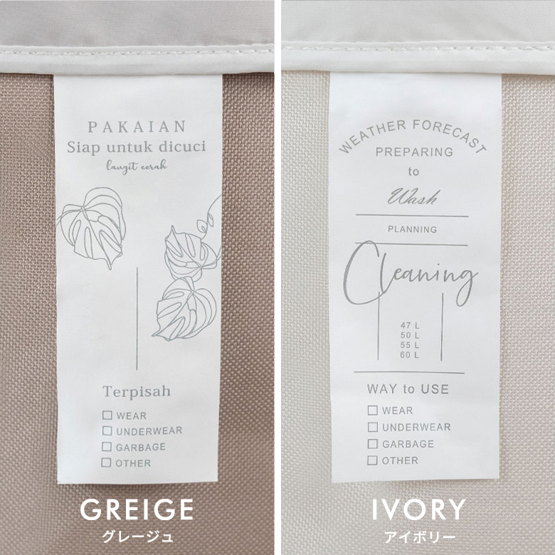 また、「アタとラタンで編まれたフタ付き大型バスケット」にぴったり収まるので、ランドリーやゴミ箱として幅広く使えます。本体は天然素材で濡れた衣類は入れられませんが、防水仕様の本品をセットすれば濡れた衣類も安心。
