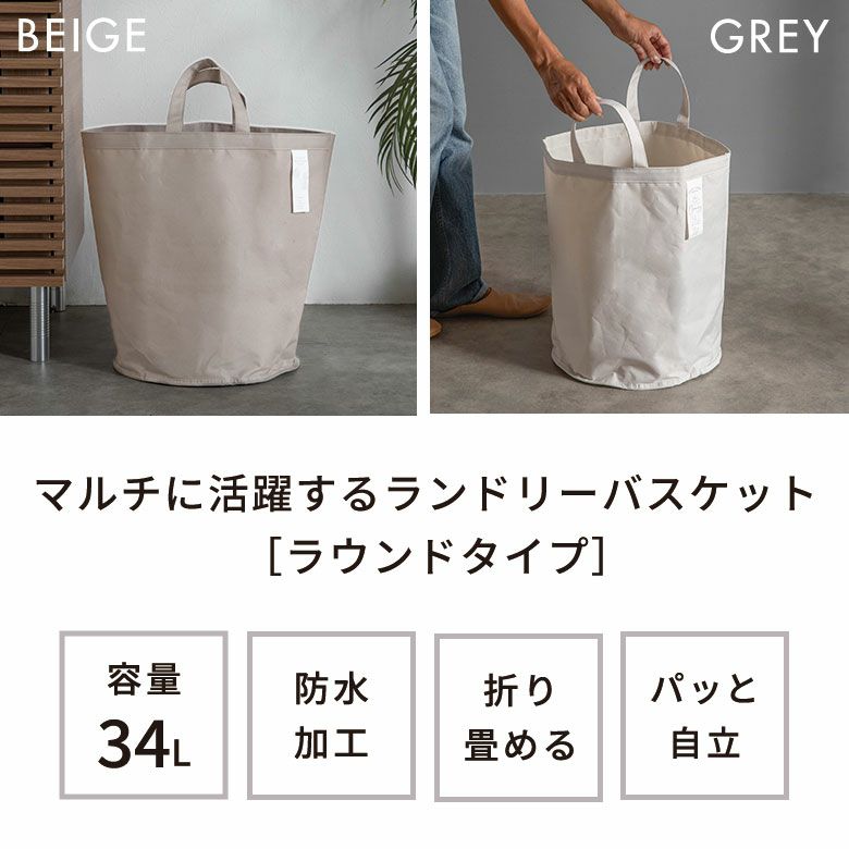 カラーはインテリアに馴染むベージュとグレーの2色展開。トートバッグやエコバッグ、ショッピングバッグとしても使える便利なデザインで、底が円形の可愛らしいフォルムもポイント。レジャーやアウトドアにでも活躍する、おしゃれで実用的なランドリーバスケットです。
