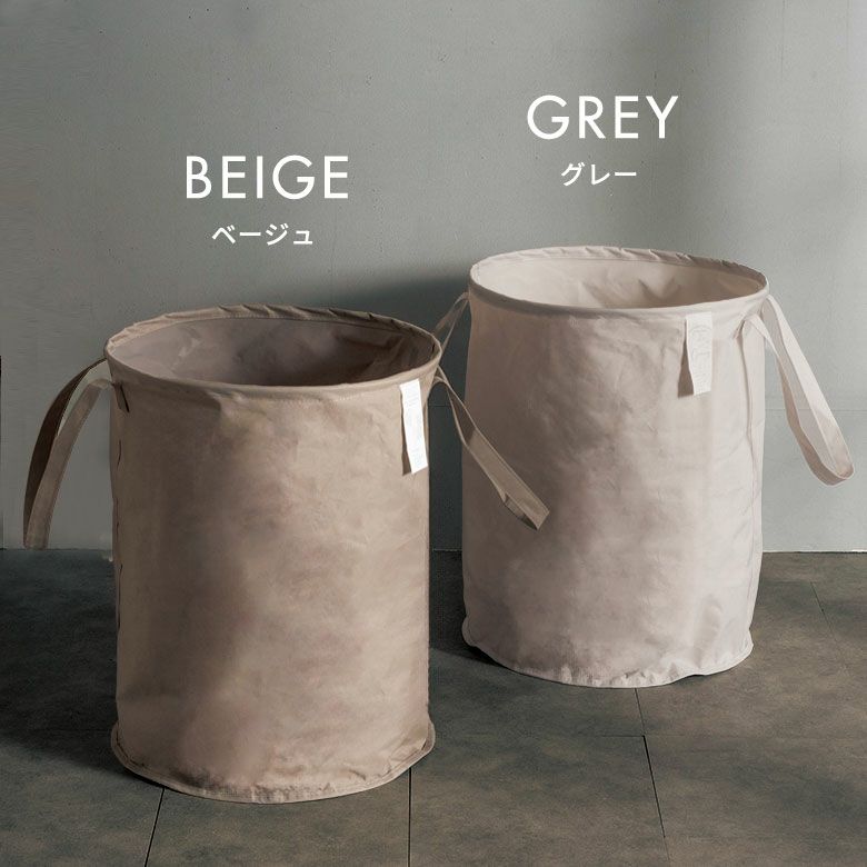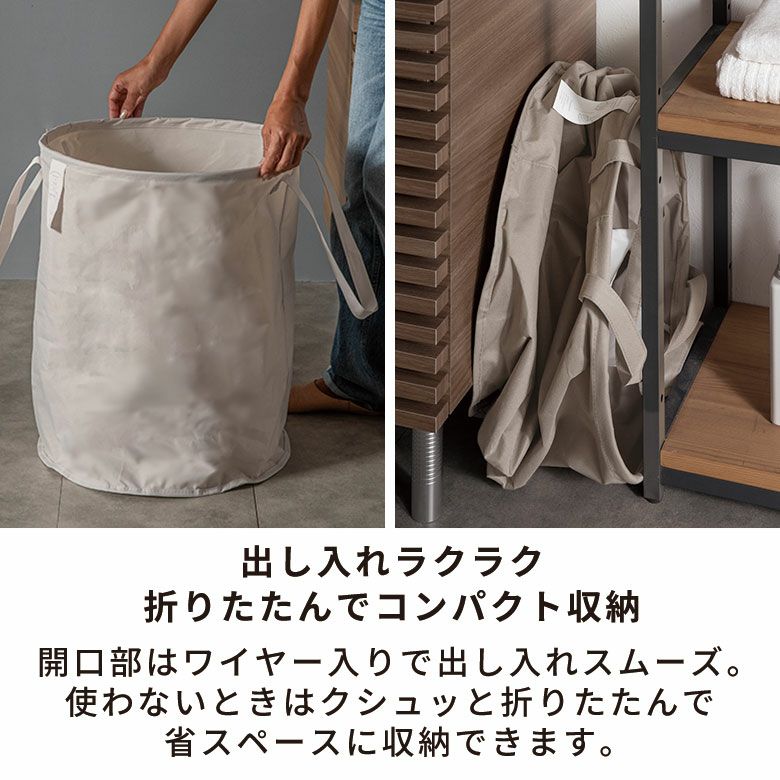 開口部はワイヤー入りで出し入れしやすく、使わないときは折りたたんで省スペース収納。中身を入れると安定して自立し、軽量で持ち運びもラクラク。ランドリールームはもちろん、リビングや子ども部屋、レジャーやアウトドアでも活躍します。カラーは、インテリアになじむベージュとグレーの2色展開です。