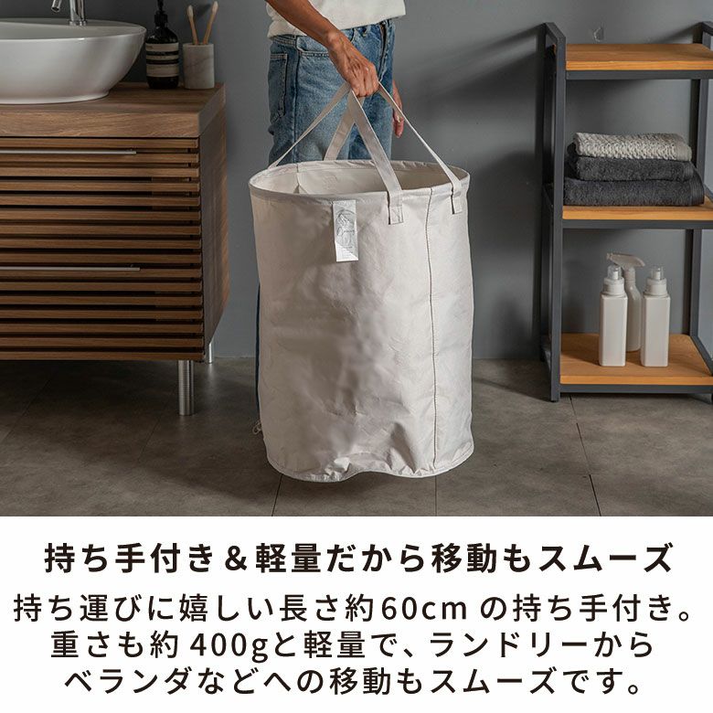持ち運びに嬉しい長さ約60cmの持ち手付き。重さも約400gと軽量で、ランドリーからベランダなどへの移動もスムーズです。中身を入れるとしっかり自立するので、洗濯物を干している間も安心です。
