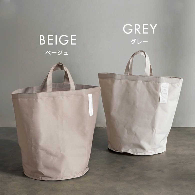 カラーはインテリアに馴染むベージュとグレーの2色展開。トートバッグやエコバッグ、ショッピングバッグとしても使える便利なデザインで、底が円形の可愛らしいフォルムもポイント。レジャーやアウトドアにでも活躍する、おしゃれで実用的なランドリーバスケットです。
