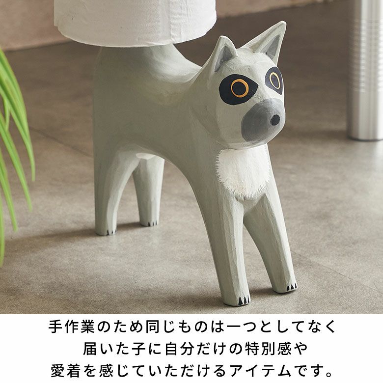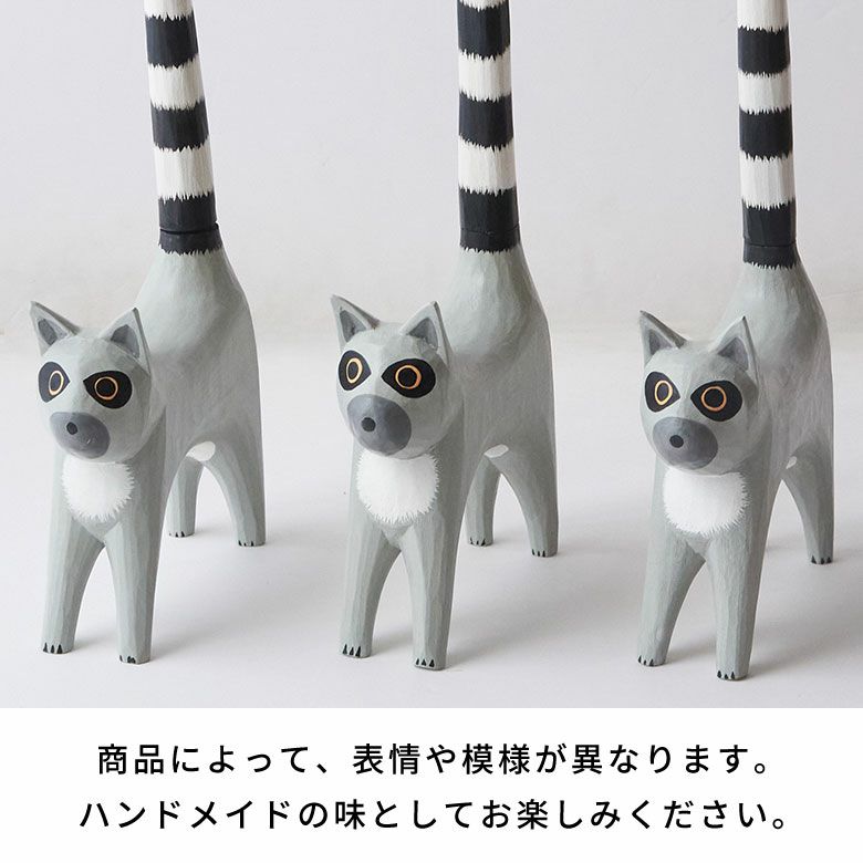 天然素材アルベシアウッドを使用したワオキツネザルのトイレットペーパーホルダー。ぴーんと真上に伸びた長い尻尾がチャームポイントで、ワオキツネザル特有のしましま模様を可愛く表現しました。すべて手作業で作られているため形やペイントには1点1点個性があり、ハンドメイドならではの温かみを感じられます。トイレだけでなくオブジェのようにリビングや玄関などに飾って、インテリアとして楽しむのもおすすめです。