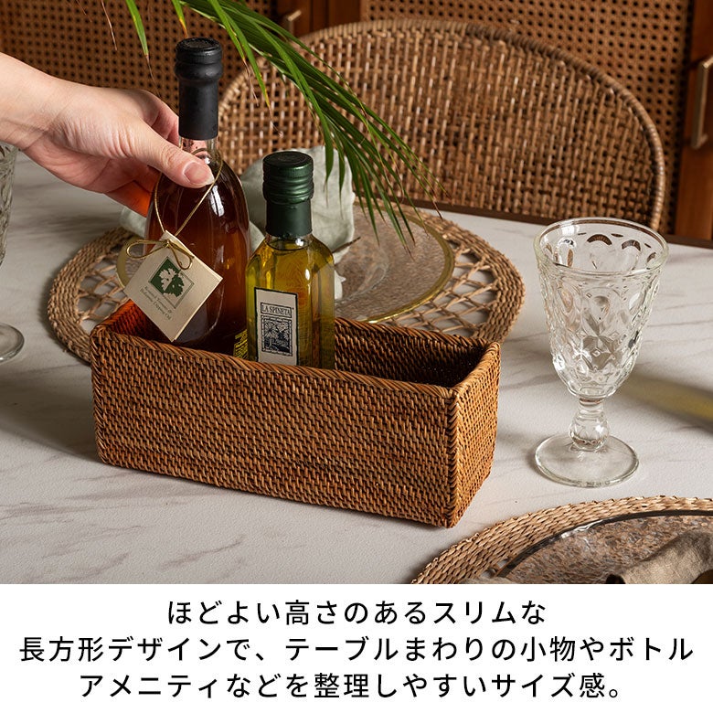 ほどよい高さのあるスリムな長方形デザインで、テーブルまわりの小物やボトル、アメニティなどを整理しやすいサイズ感。奥行きを抑えたコンパクト設計のため、棚上や洗面スペース、キッチンカウンターなど限られたスペースにも収まりやすく、空間を無駄なく活用できます。