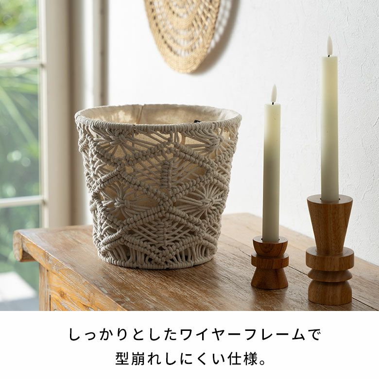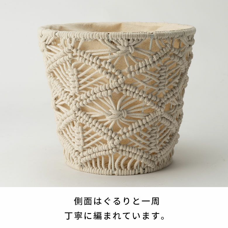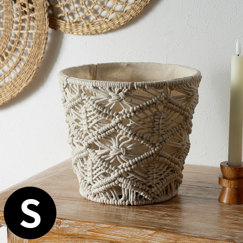 存在感たっぷりのマクラメ編みが魅力のバスケットです。
