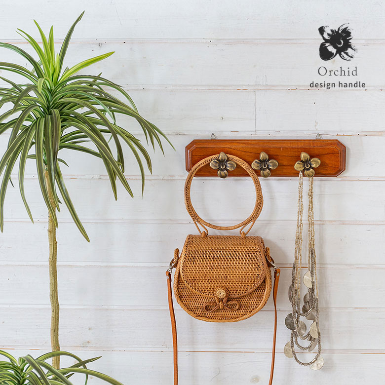 南国リゾートの雰囲気漂う、オーキッドデザインの真鍮ハンドル。