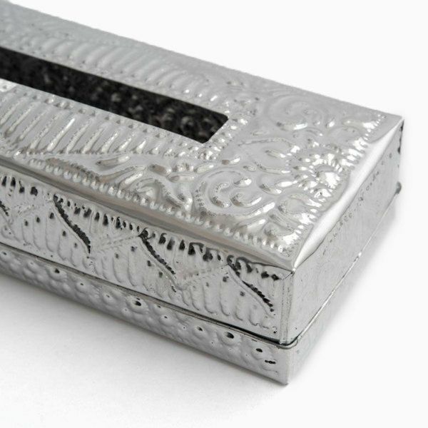 アジアンな模様が全面に施された、アルミのティッシュケース。
