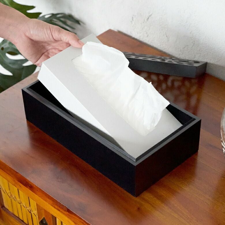 市販のティッシュペーパーを入れ、蓋を被せるだけ。