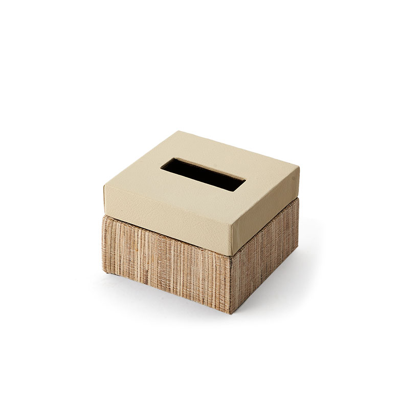 インドネシアの職人によるハンドメイドの温かみと自然素材の美しさが魅力の、ウォーターヒヤシンス素材×フェイクレザーのティッシュケース。