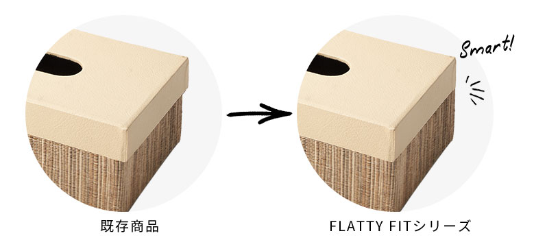 FLATTY FITシリーズは、4つのサイズ展開でお好みのサイズにぴったり合ったティッシュケースをお選びいただけるだけでなく、既存のティッシュケースの蓋の形状を改良し、よりすっきりとフィットするデザインに仕上げたことで、スマートで洗練された印象を演出します。