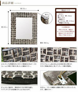 | バリ島で見つけてきた壁掛けミラーは、エキゾチックな雰囲気を感じさせるモザイク柄を丈夫なチークのフレームに手彫りで贅沢にあしらっています。 ホワイトウォッシュ加工されより立体感のある鏡フレームは、無垢材がもつ重厚感と相まって味わい深いアンティーク調の雰囲気を楽しめます。 |