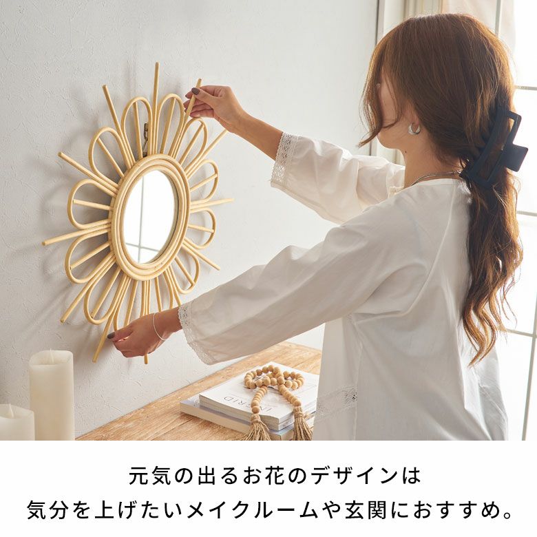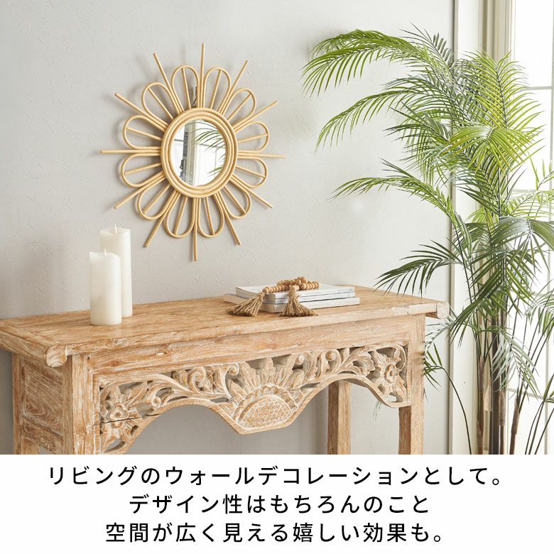 リゾート気分が高まる南国風のデザインミラーはサイズも大きく抜群の存在感なので