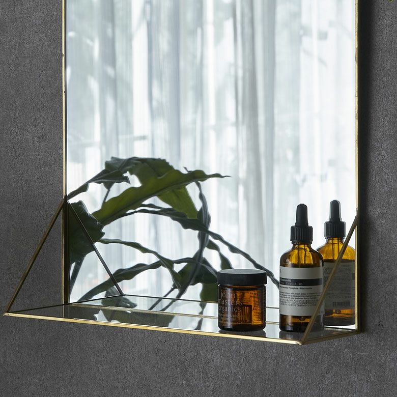 長方形の大型ミラーで、ガラスの台付きデザイン。