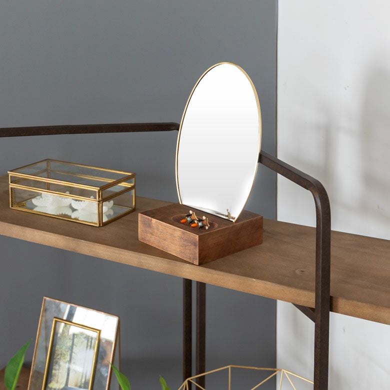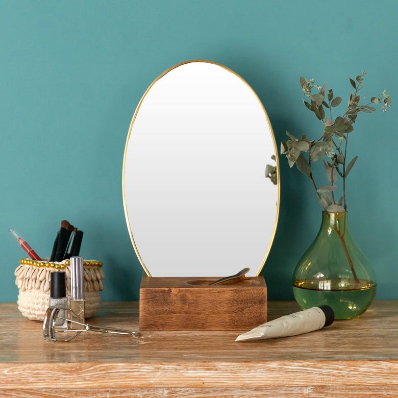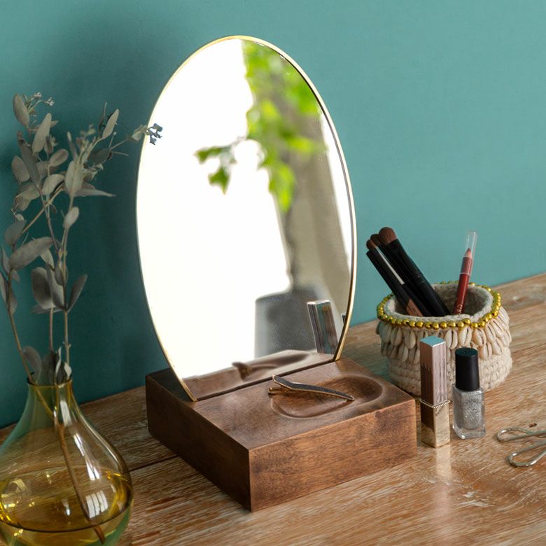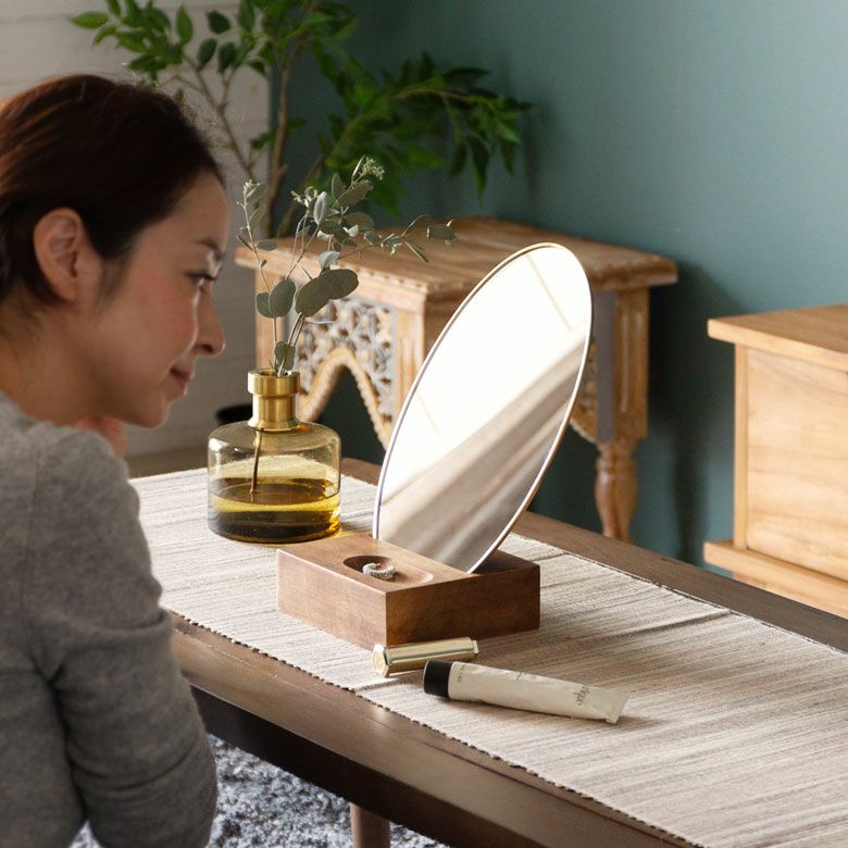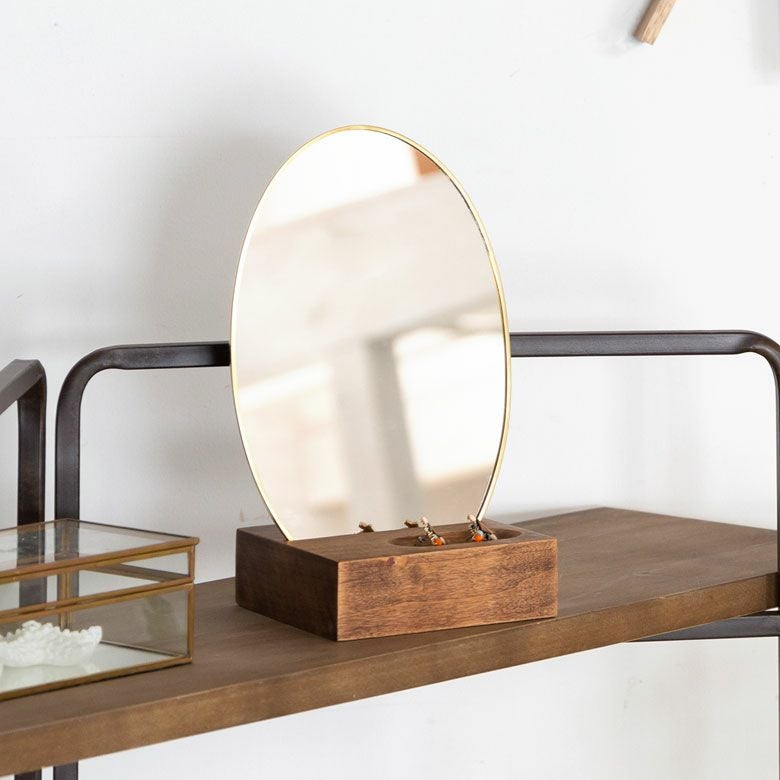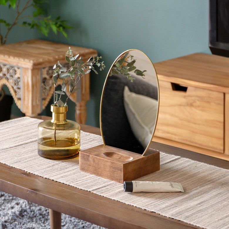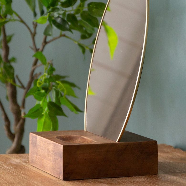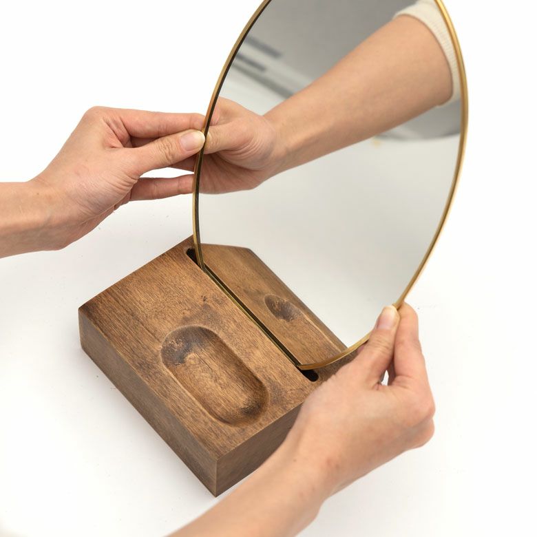 天然木のスタンドに、真鍮フレームのミラーを差し込んで使う、
