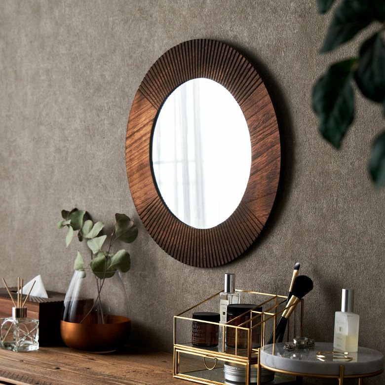 表面の凹凸が印象的な、木製の壁掛けミラー。