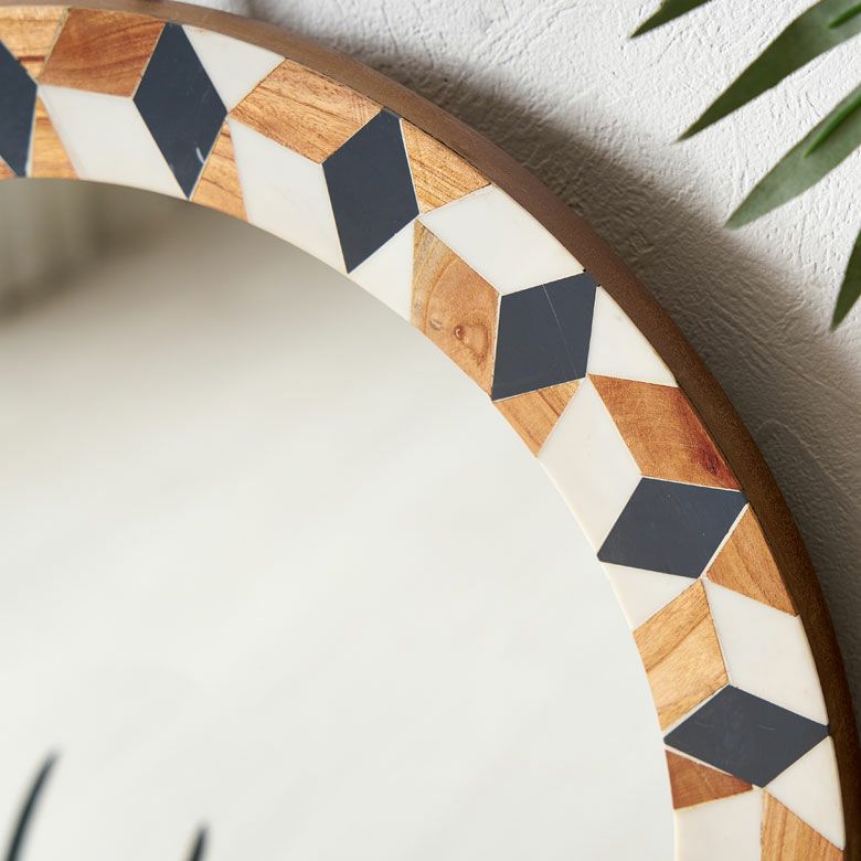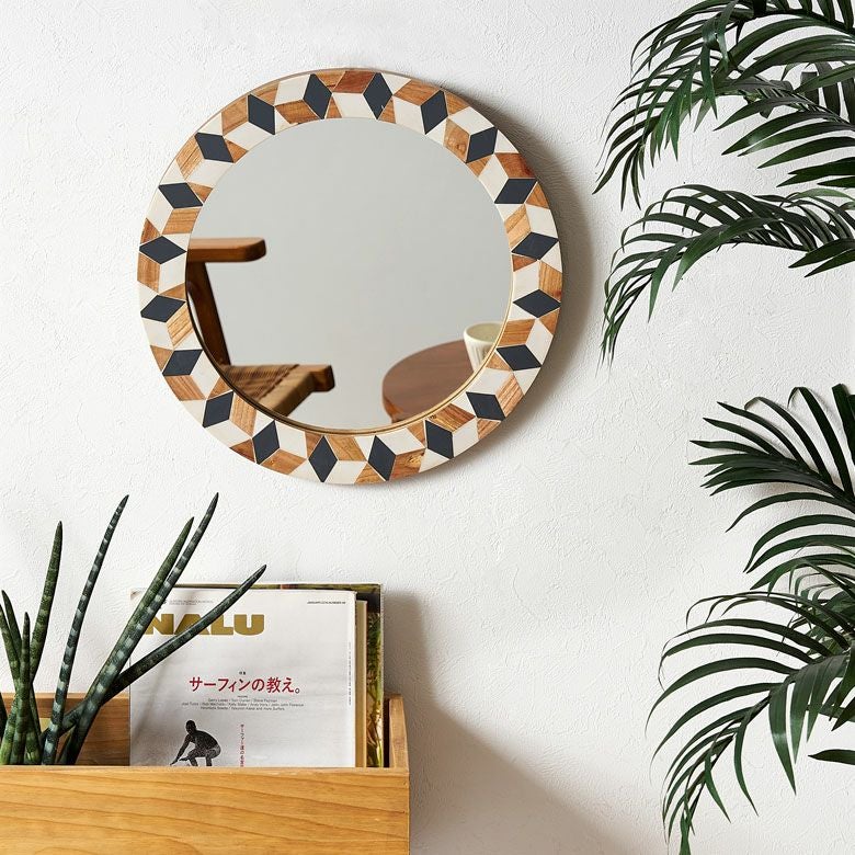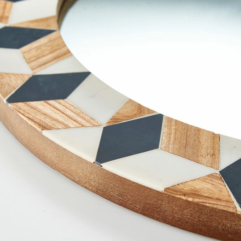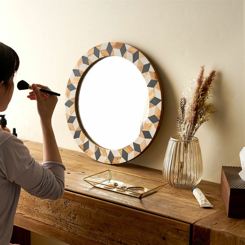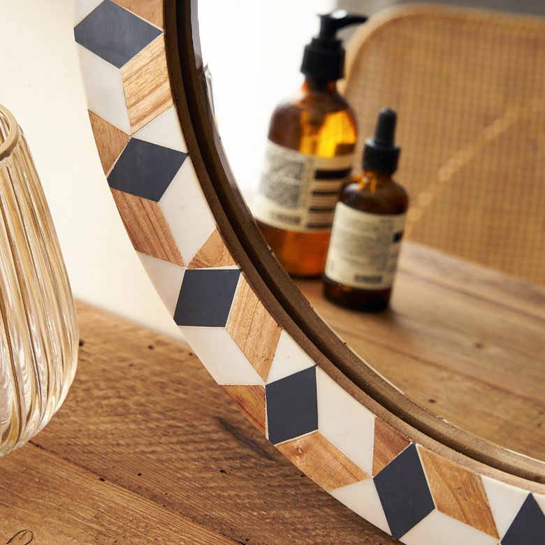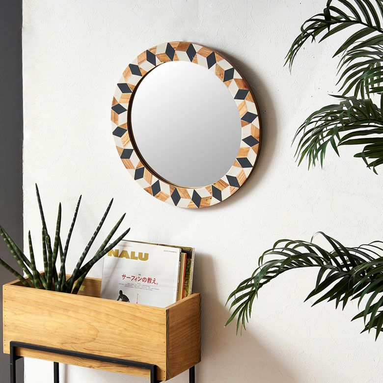 ラウンド インテリアミラー 壁にかける 丸い鏡 玄関鏡 新生活 鏡 壁掛け鏡 円形 丸型 ウッド×レジン ジオメトリック柄 約 W 45 × D 45 × H 2 cm 鏡直径 約35cm かがみ ウォールミラー 化粧鏡 壁かけ鏡 立て掛け鏡 ウォールデコレーション リビング 寝室 玄関 トイレ おしゃれ 北欧 モロッカン アジアン雑貨 モロッコ BOHO [34552]