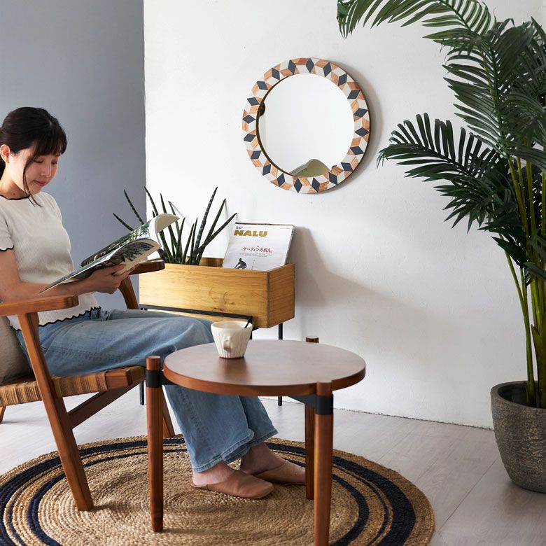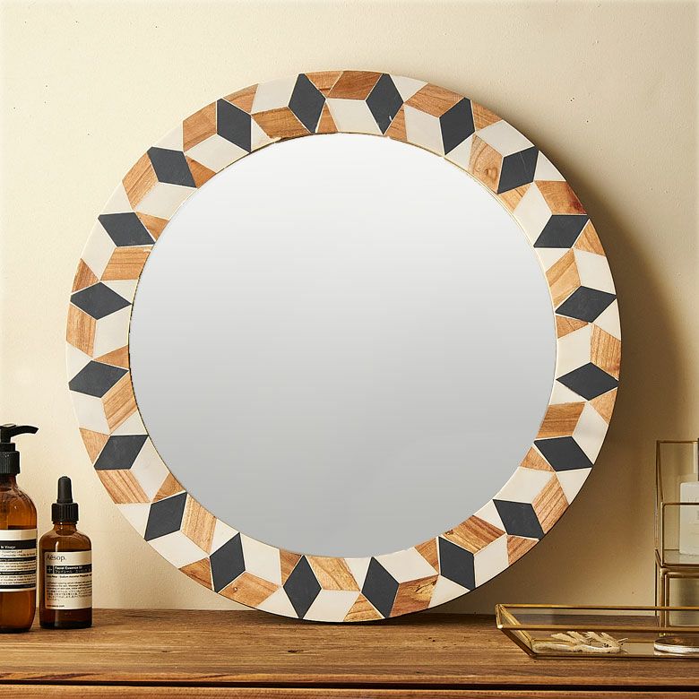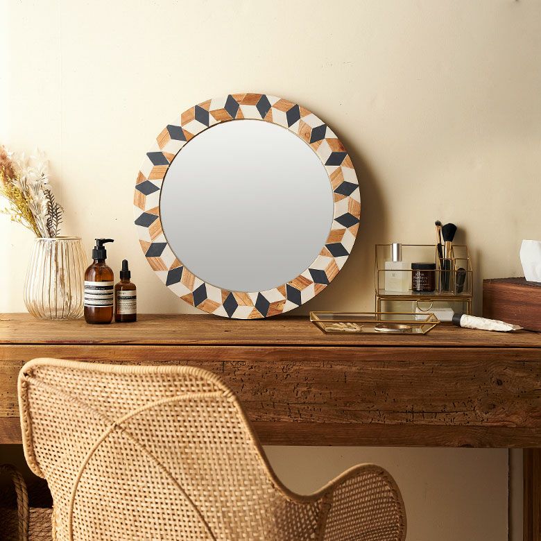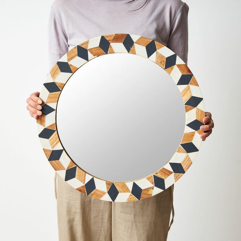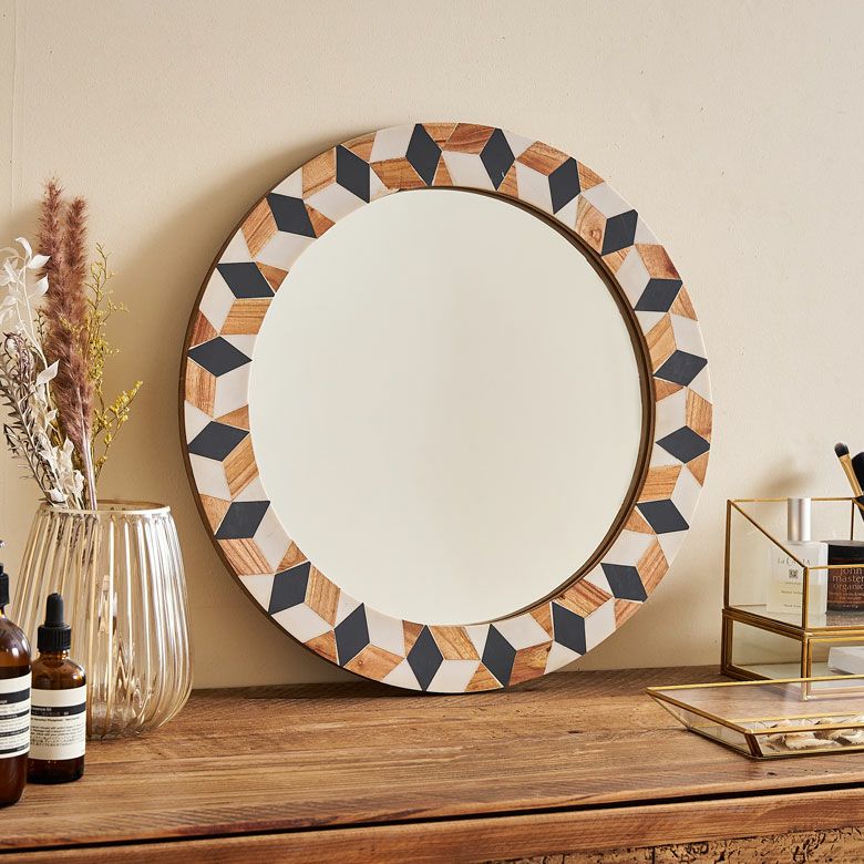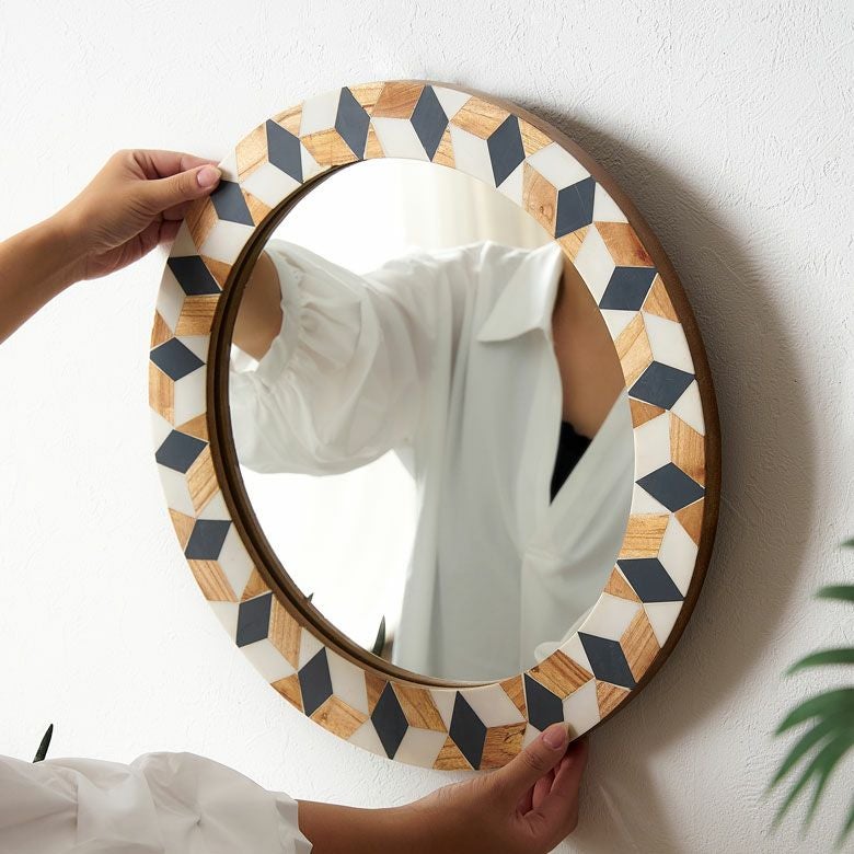 ラウンド インテリアミラー 壁にかける 丸い鏡 玄関鏡 新生活 鏡 壁掛け鏡 円形 丸型 ウッド×レジン ジオメトリック柄 約 W 45 × D 45 × H 2 cm 鏡直径 約35cm かがみ ウォールミラー 化粧鏡 壁かけ鏡 立て掛け鏡 ウォールデコレーション リビング 寝室 玄関 トイレ おしゃれ 北欧 モロッカン アジアン雑貨 モロッコ BOHO [34552]