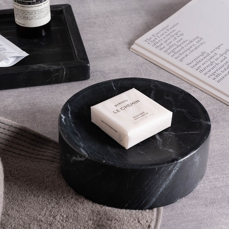 天然大理石を贅沢に削り出した大理石トレイは、上質な客室空間を演出するインテリアオブジェとして。