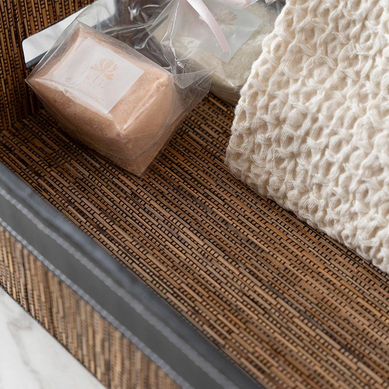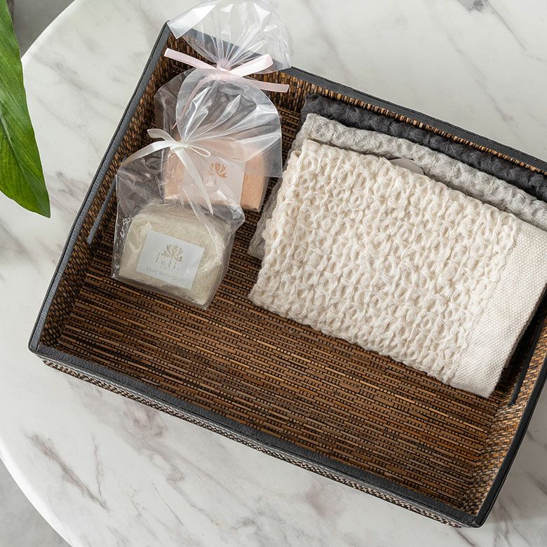 アメニティトレイとして、洗面まわりのタオルをまとめたり