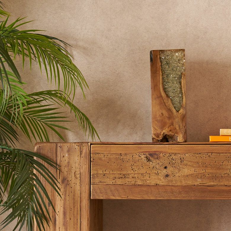 リサイクルチーク材とガラスの組み合わせが、エスニックスタイルの多様な文化的要素と融合します。手作り感のある質感が、異国の雰囲気を強調します。