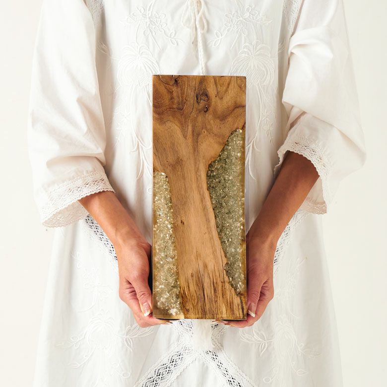 ・味わい深い古木のチーク材の節や欠け部分にクラッシュガラスを流し込んだ、個性的なオブジェ