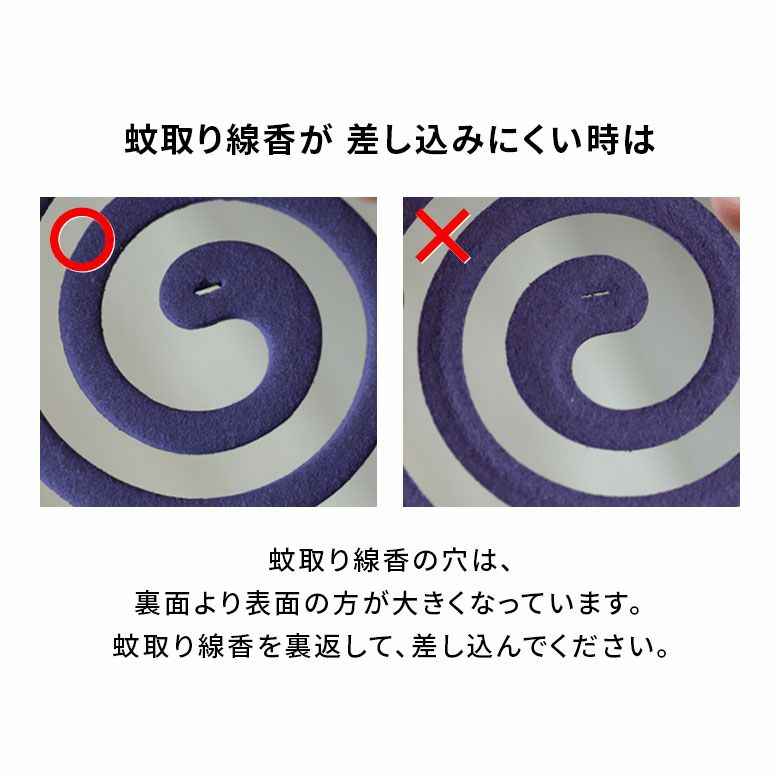 蚊取り線香の穴は、裏面より表面の方が大きくなっています。 蚊取り線香を裏返して、差し込んでください。