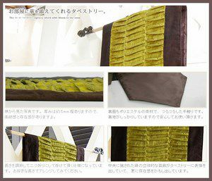 長さを調節して二つ折りにして掛けていただく仕様になっています。お好きな長さでアレンジしてみてください。 中央に施された緑の立体的な装飾がタペストリーに表情を出していて、更に存在感をかもし出しています。