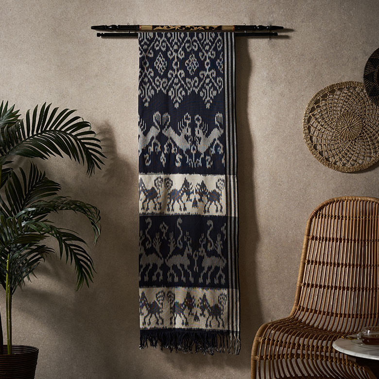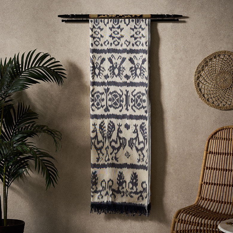 繊細な柄が美しく、インテリアに取り入れればたちまちアジアンリゾートの雰囲気に。イカットハンガーとセットで使うことで、プリミティブな空間の魅力がさらに広がります。イカットはアジアンリゾートインテリアには欠かせない装飾品で、当店でも長年取り扱っている商品。インドネシアを訪れ、現地買い付けしてきたアイテムです。