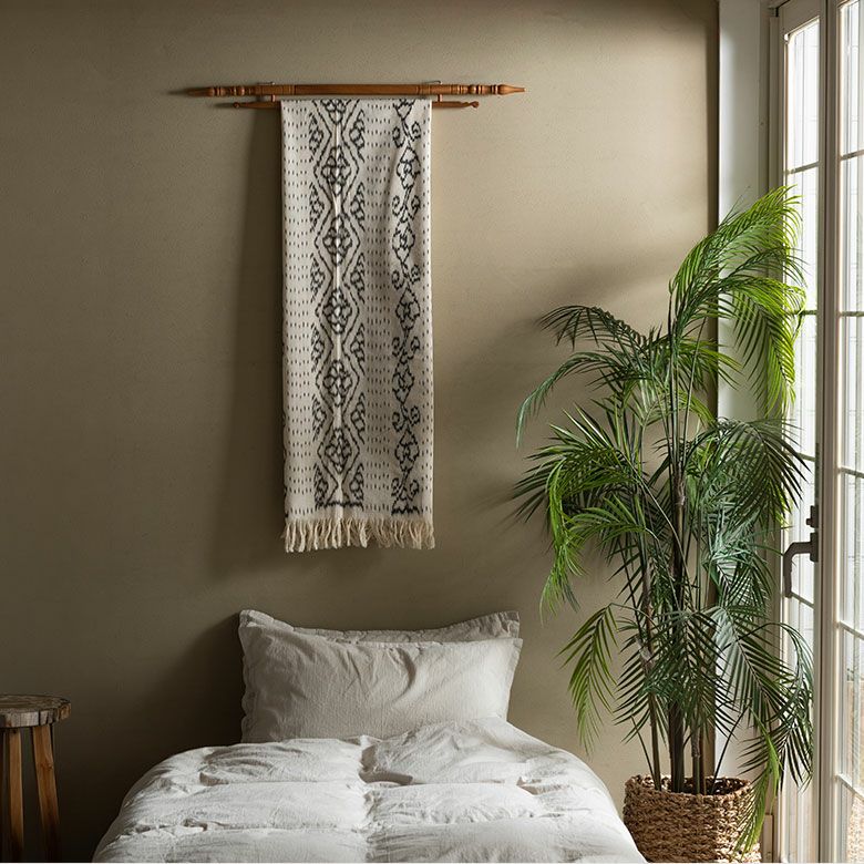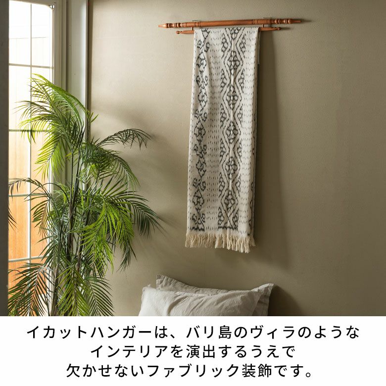 イカットは、バリ島のヴィラのようなインテリアを演出するうえで欠かせないファブリック装飾。壁に掛けるだけで、空間全体にアジアンリゾートの穏やかな雰囲気が広がります。