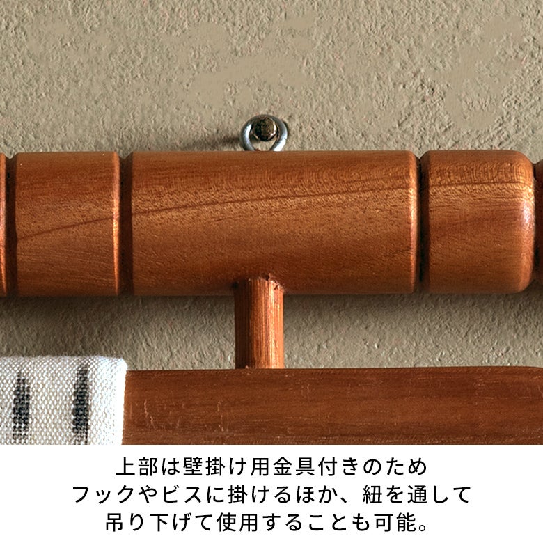 上部は壁掛け用金具付きのため、フックやビスに掛けるほか、紐を通して吊り下げて使用することも可能です。スリット構造で、約39cmまでのファブリックに対応。幅が大きい場合は、折り畳んで掛けるアレンジもおすすめです。また、S字フックを使用すれば、帽子やストール、軽めのバッグなどを飾るウォールデコレーションとしても活躍します。