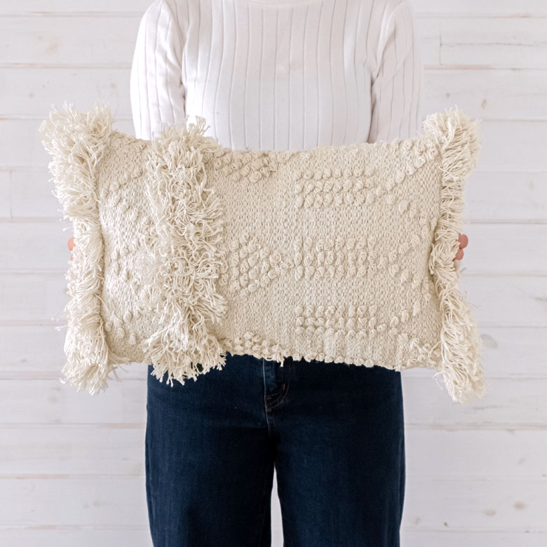 手に持つとこの大きさ。枕や腰当てに最適な50cm×30cmです。 |