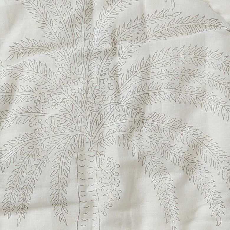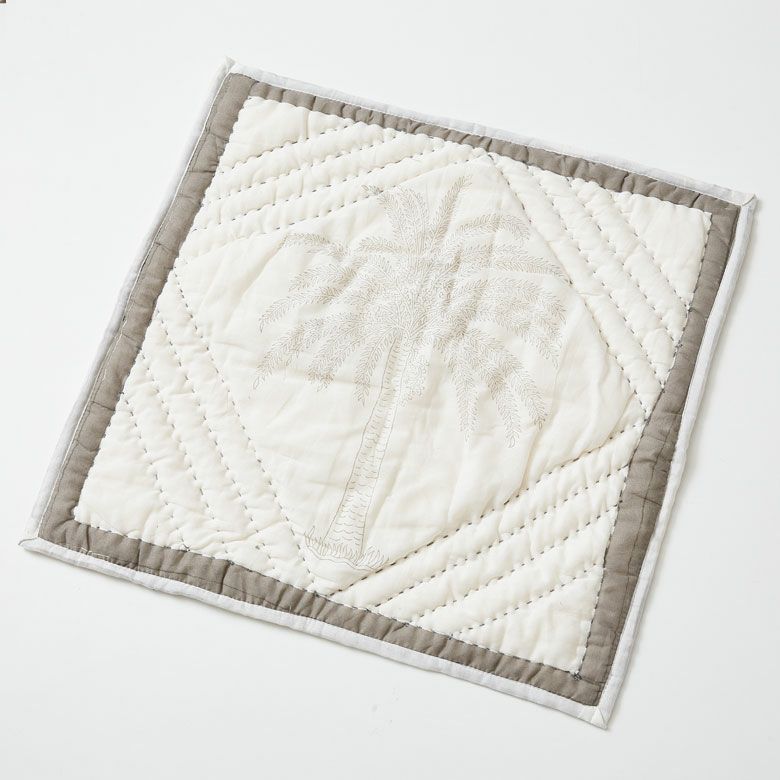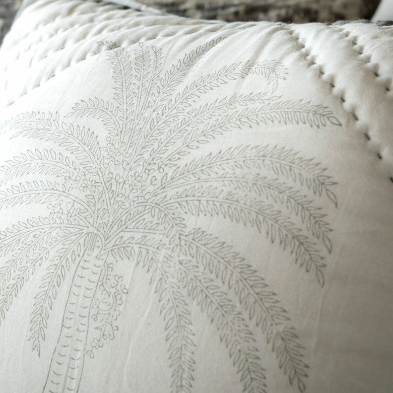 お揃いのヤシの木デザインのマルチカバーと合わせて、ベッドやソファでお使いただくことも。