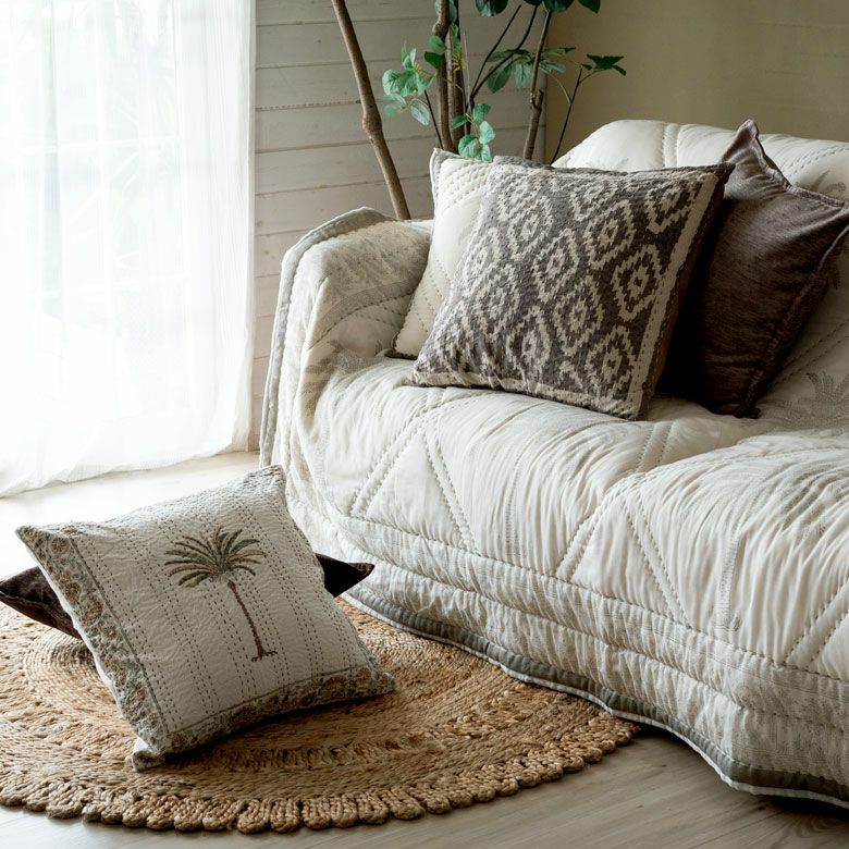 お揃いのデザインのマルチカバーと合わせて、ベッドやソファでお使いただくことも。