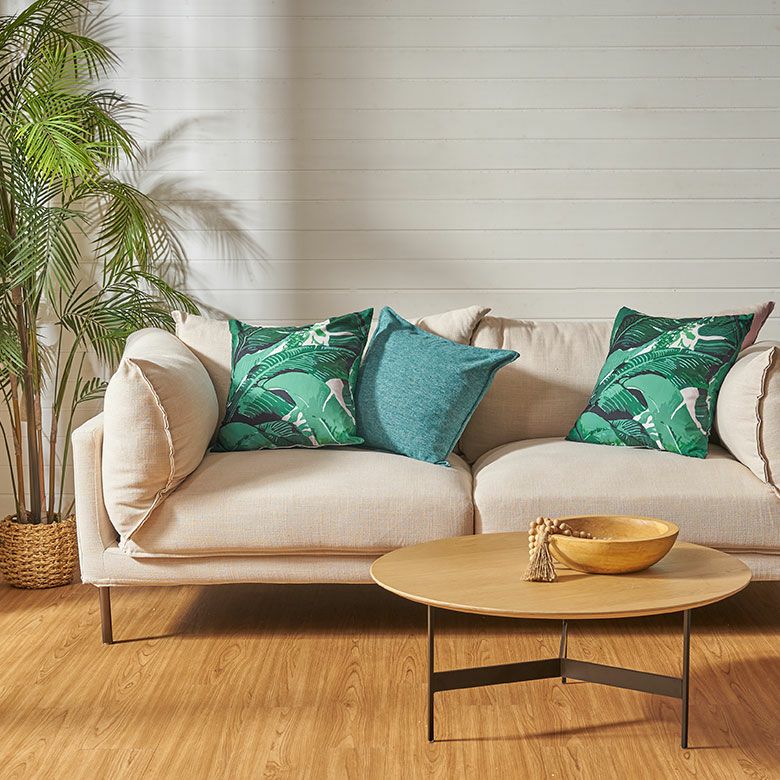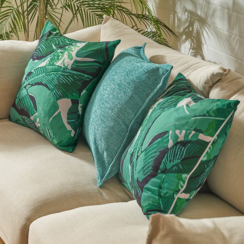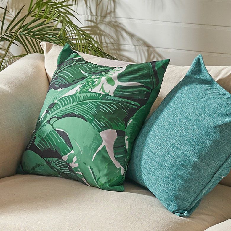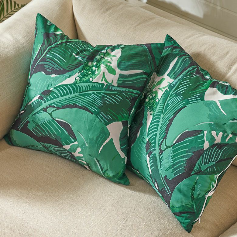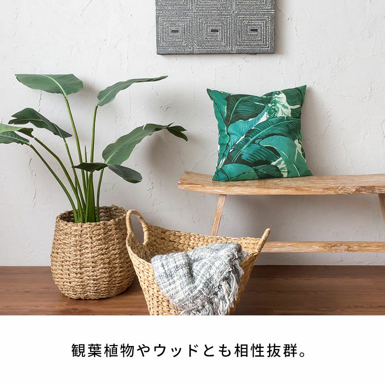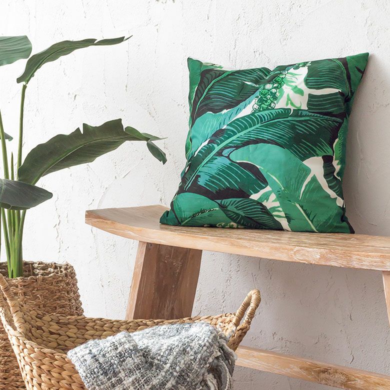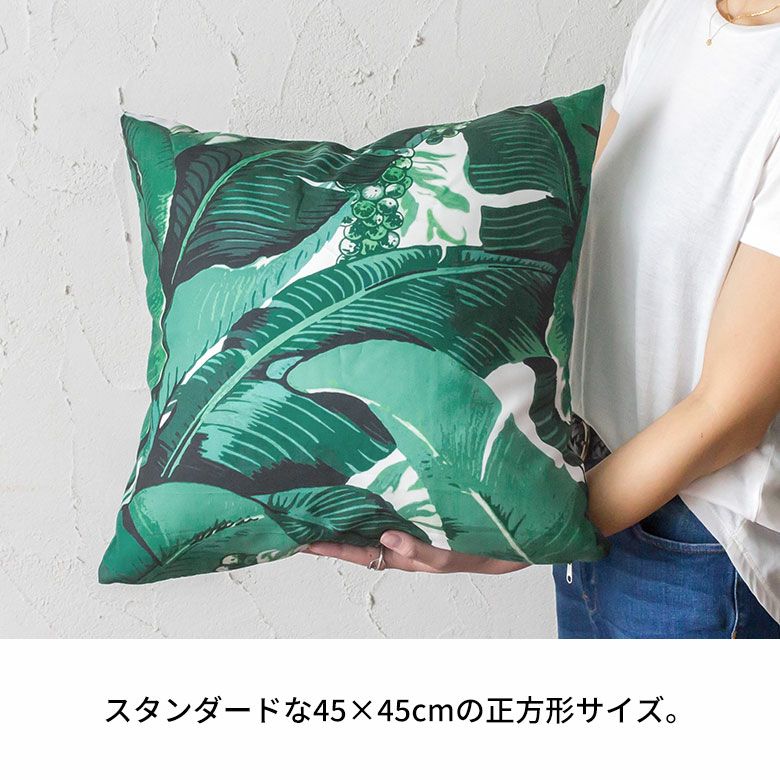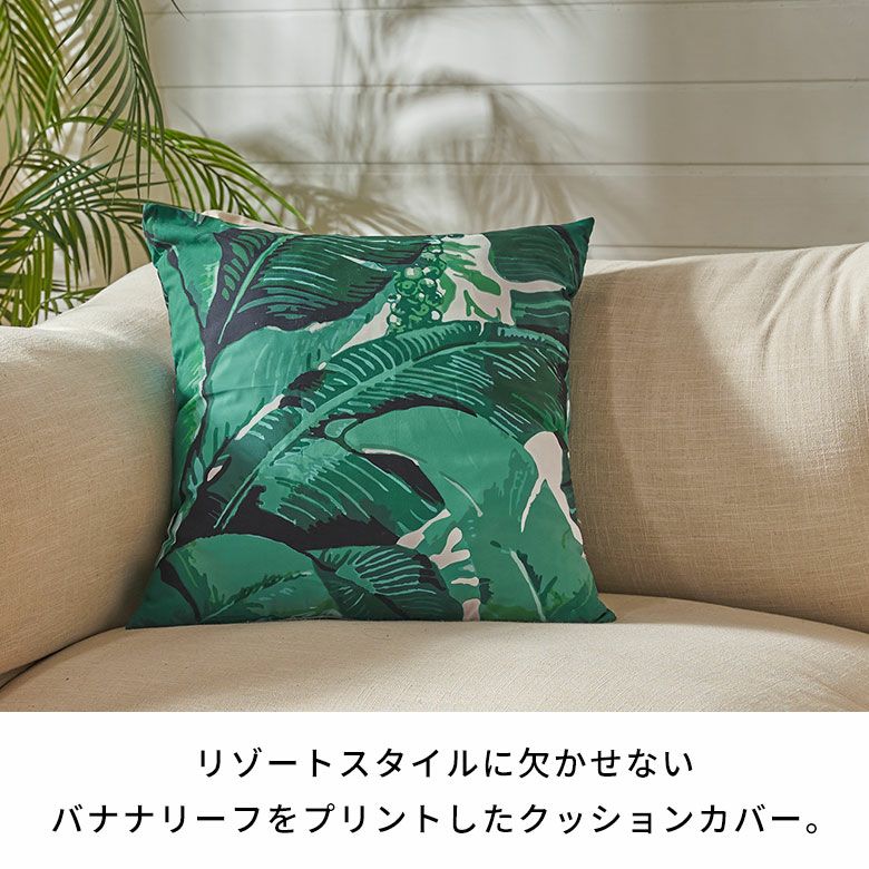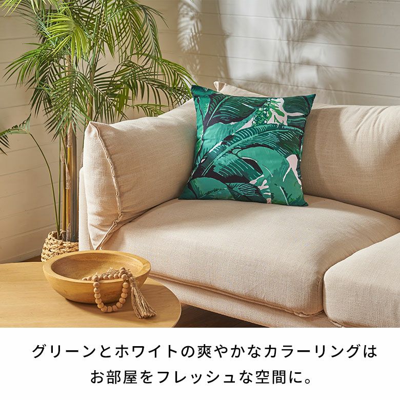 リゾートスタイルに欠かせないバナナリーフをプリントしたクッションカバー。スタンダードな45×45cmの正方形サイズで、使いやすいサイズ感です。インテリアのアクセントになるグリーンとホワイトの爽やかなカラーリングは、お部屋をフレッシュな空間に。