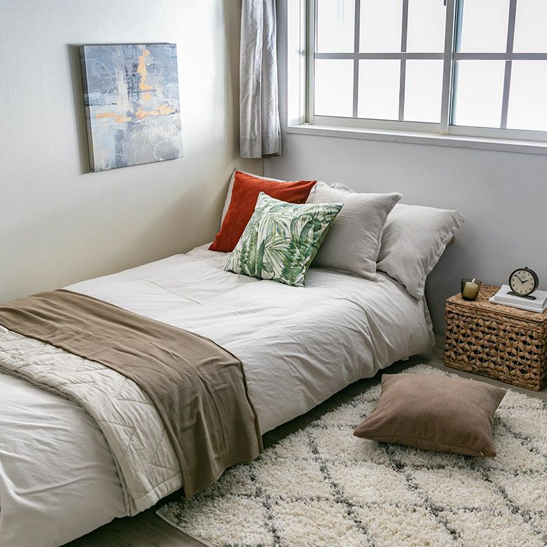 シンプルなデザインのクッションと合わせて、デコラティブピローとしても◎