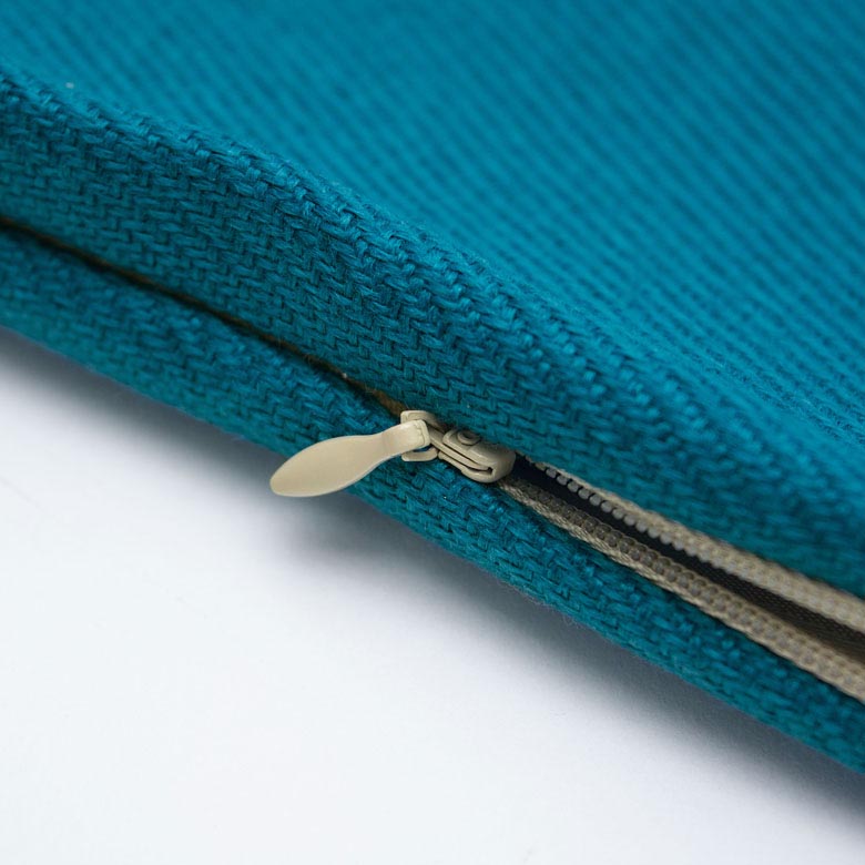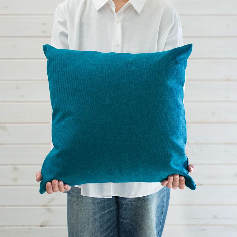 落ち着きのある緑掛かったブルーのクッションカバー。