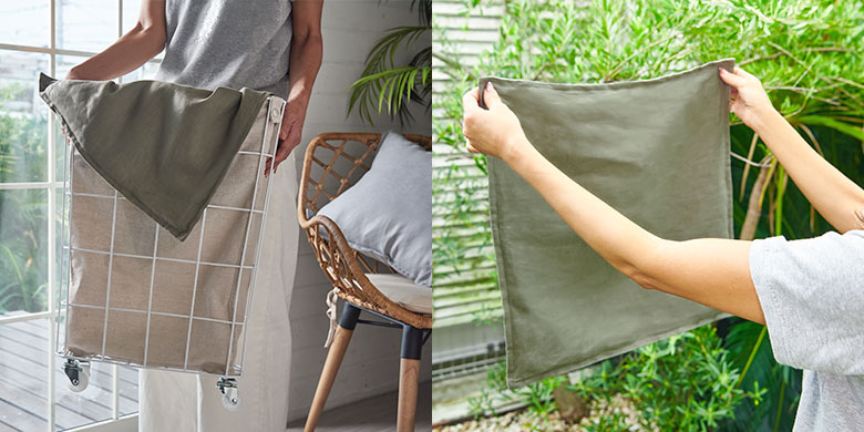 お洗濯後、部屋干しでも乾きやすく、湿度の高い日本の気候にもおすすめの天然素材です。